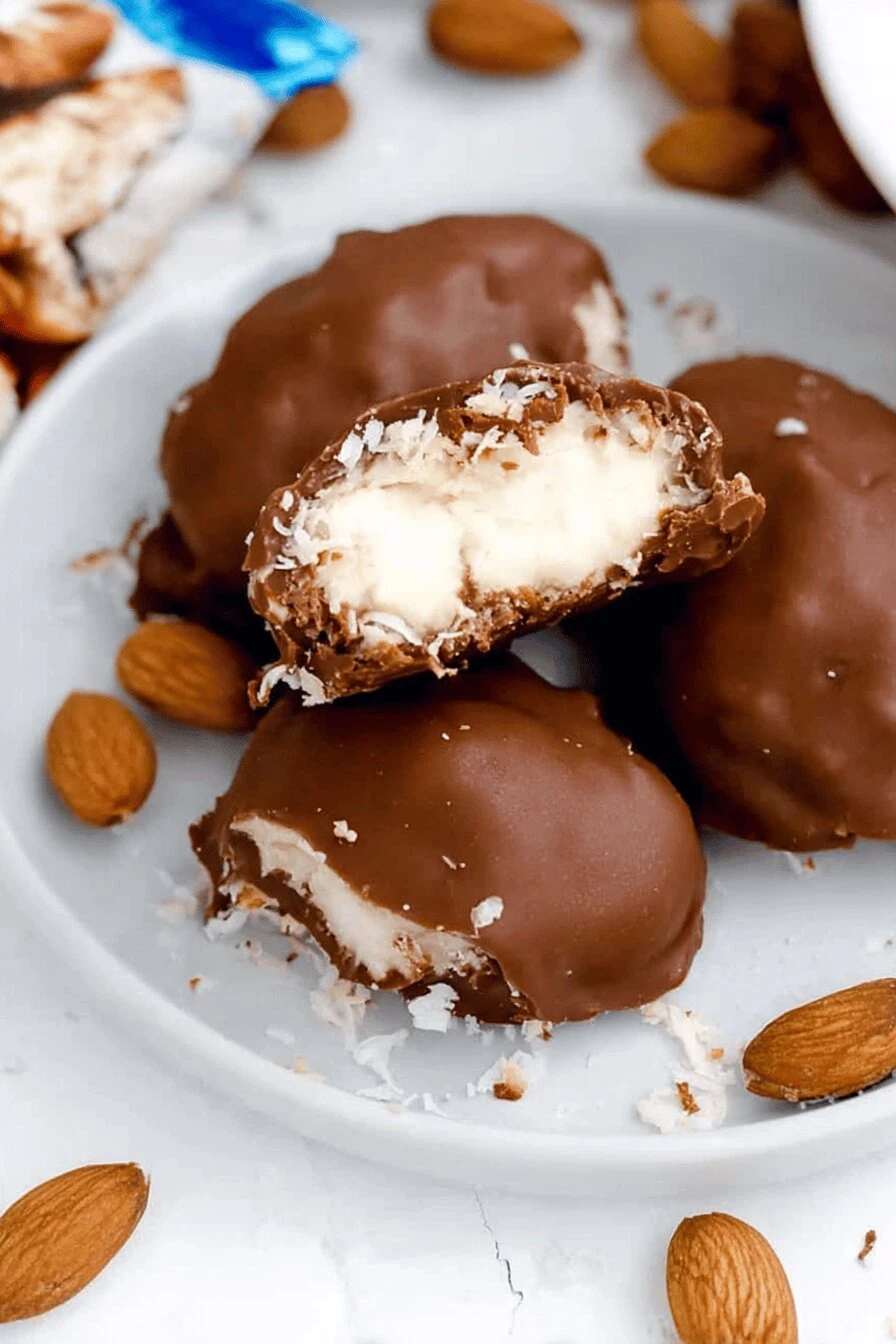 Takes 35 minutes of actual work—the rest is fridge time, which you don’t have to think about. No oven. Just a mixer and a microwave. No bake means less heat in the kitchen, which matters in summer. Tastes like Almond Joy but better because you controlled the sweetness. Almonds on top make them look intentional. Chocolate cracks in a satisfying way. Lasts three days, freezes longer if you care about that.