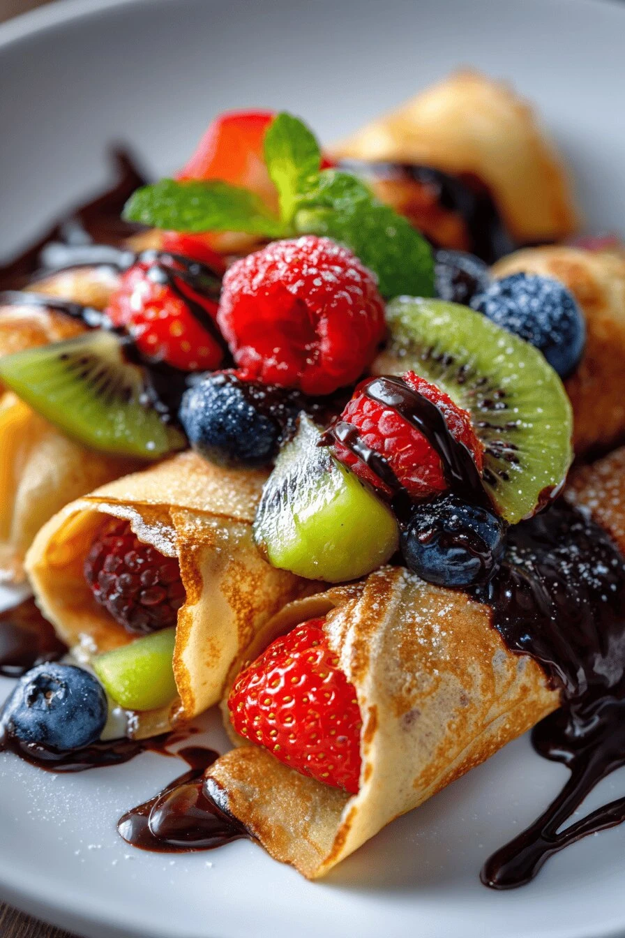 - 4 Roll each crêpe gently. Arrange on plates. Spoon over warm dark chocolate sauce generously. Scatter mixed berries and kiwi slices on top. Eat immediately. Sauce seeps into crepe folds; berries add tart freshness and vibrant texture.