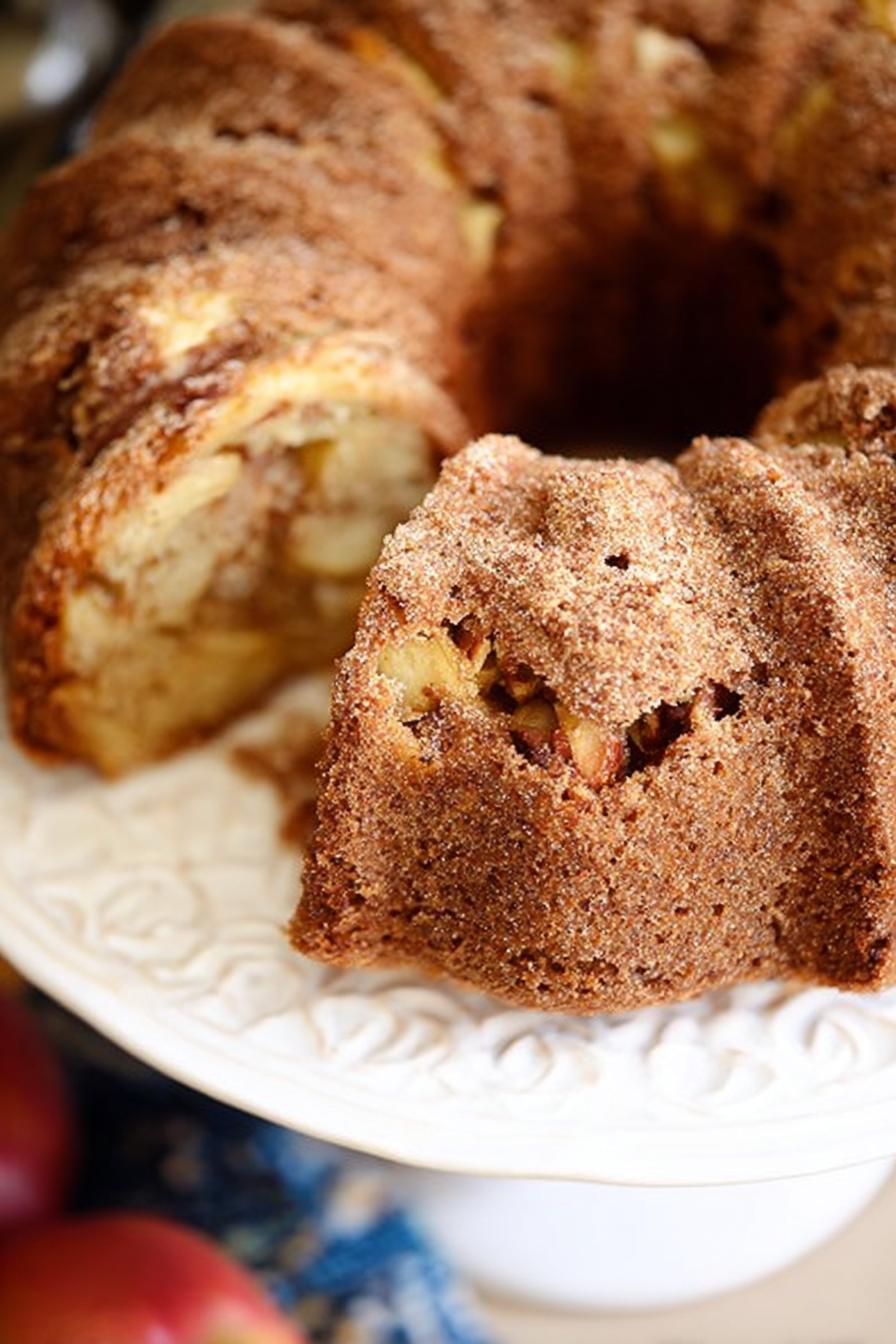 A dense, moist apple and nut cake baked in a Bundt pan. Combines diced fresh apples with chopped pecans for texture contrast. Uses baking powder in place of baking soda for a lighter crumb. Sugar slightly reduced, oil swapped for melted butter. Vanilla swapped with almond extract for a subtle twist. Adjust baking time to catch golden crust and firm edges without drying out. Serves twelve, about 570 calories each. Great for autumn, but year-round comfort.
