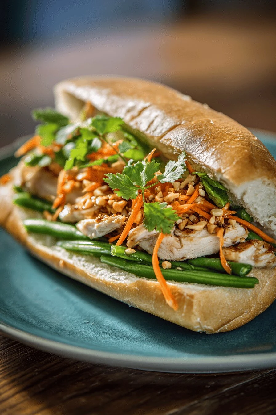 Split your rolls. Slather mayo inside both halves. Layer chicken slices first. Then the carrot salad — don’t be shy, the crunch is the point. Add the blanched green beans. They’ll be bright green. Handful of crushed peanuts. Cilantro leaves. Press the sandwich together gently. Mashed is not the move.