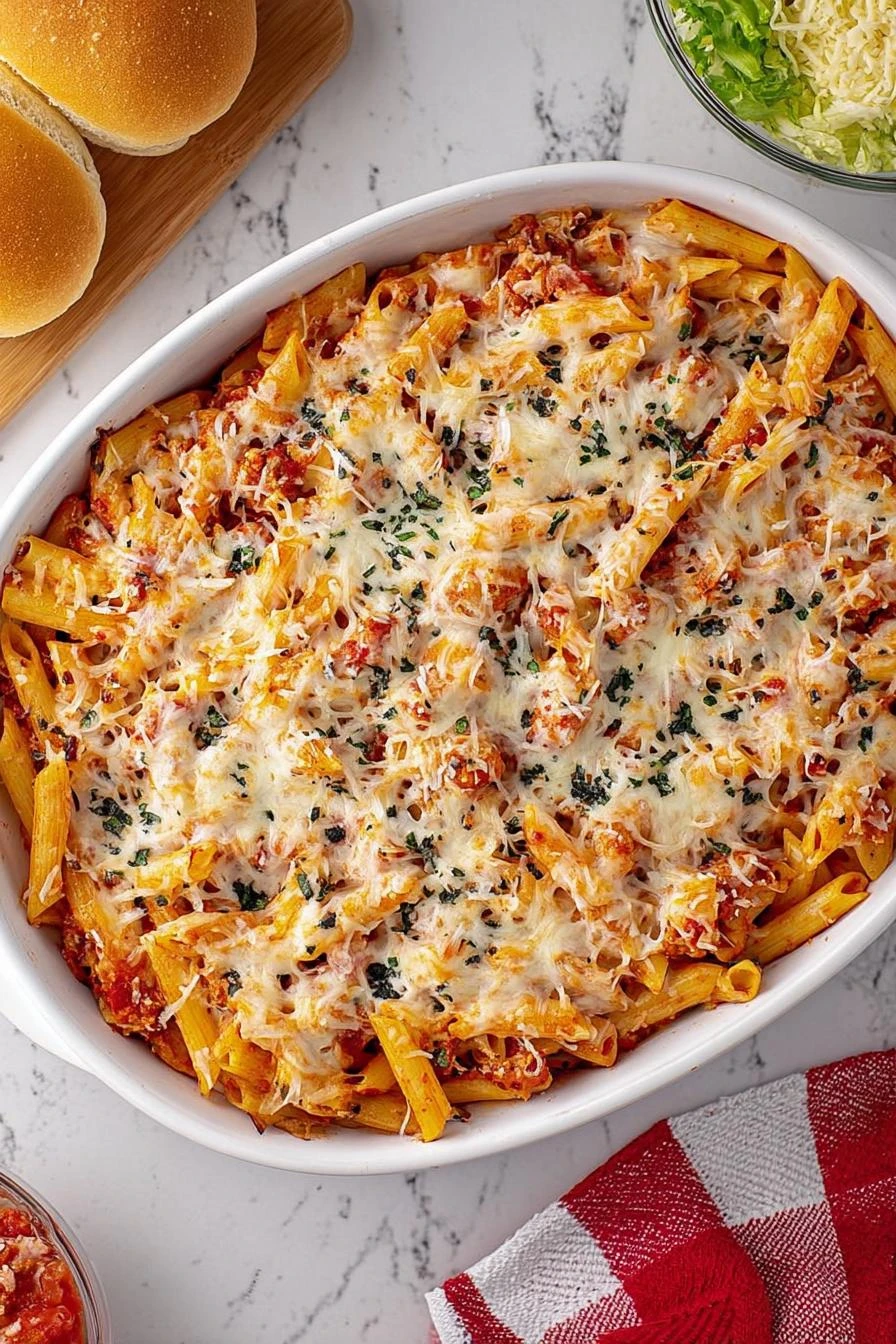 Can I make this baked mostaccioli ahead of time? Yes. Mix everything, layer it in the casserole, cover it, stick it in the fridge for up to two days. Bake straight from cold — add about 5 minutes to the cook time. It’ll take a minute to come up to temperature.