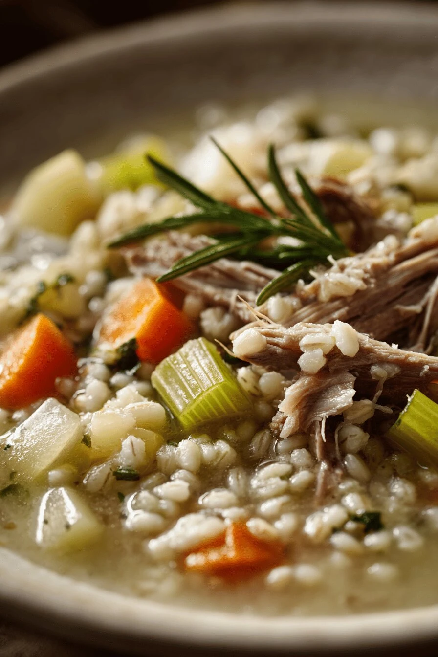 - 3 Add hot chicken stock and rosemary sprigs. Boil rapidly to start, then reduce to gentle simmer before covering partially. No rolling boil hiding aromas — watch for tiny bubble trails. Let it cook softly 40-45 minutes. Barley should be tender but chewy, turnips yielding but not mush. Stir once or twice to prevent sticking or uneven cooking.