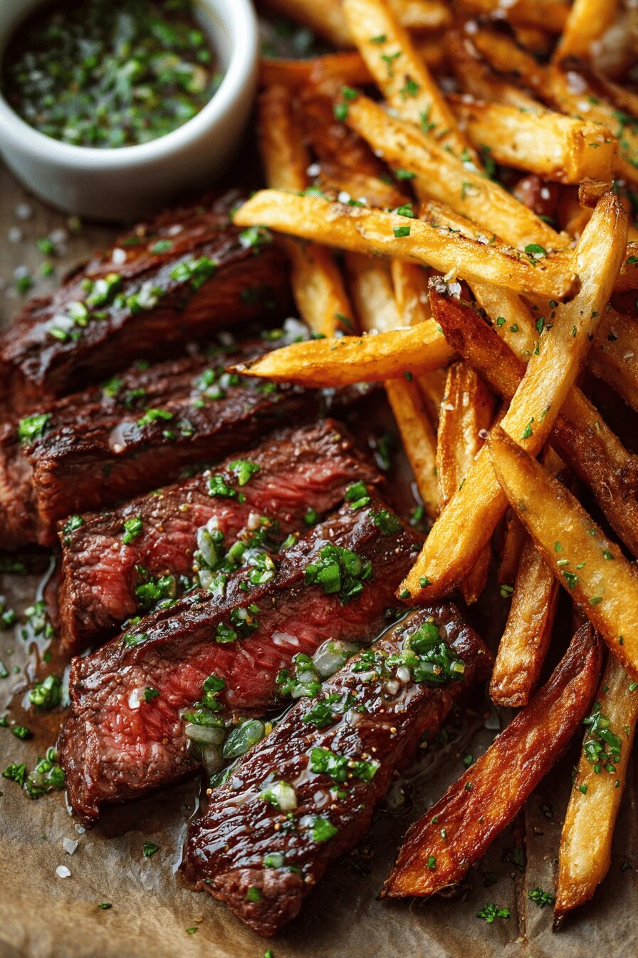 Takes 30 minutes total and tastes like you spent three hours on it. The red wine marinade goes into the meat — not just sitting on top, actually soaking in — so every bite tastes intentional. Fries are double fried, which means twice the crunch. Once soft, then crisp. Shallot butter sauce doesn’t need cream or stock. Just wine, shallots, and cold butter whisked in slow. Works every time if you don’t rush the emulsion. Serves two people with zero pretension. Beef and potato main dish that actually works.