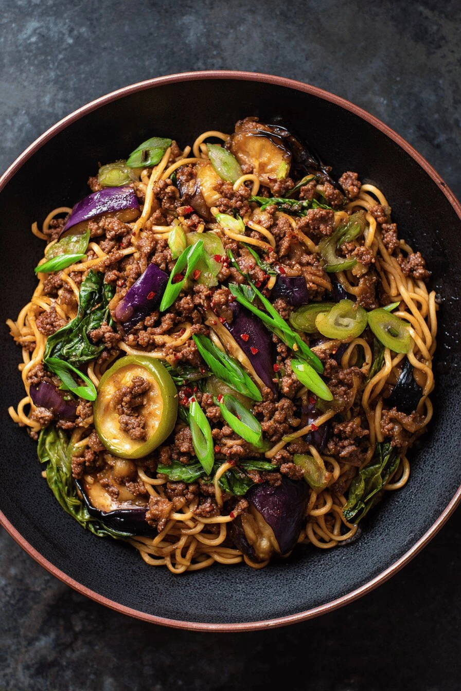 Spicy ramen that actually tastes like beef, not just noodles in broth. Takes 20 minutes to prep, 30 to cook. One skillet does the whole thing—no separate pots for vegetables. Crispy mushrooms stay crispy. Soft eggplant doesn’t turn to mush. Ground beef gets a real crust, not gray and sad. Works as dinner on a Tuesday or when you need something fast. Black bean garlic sauce does the heavy lifting flavor-wise. You could use hoisin instead and it’s still solid. Cold leftovers are somehow better the next day.