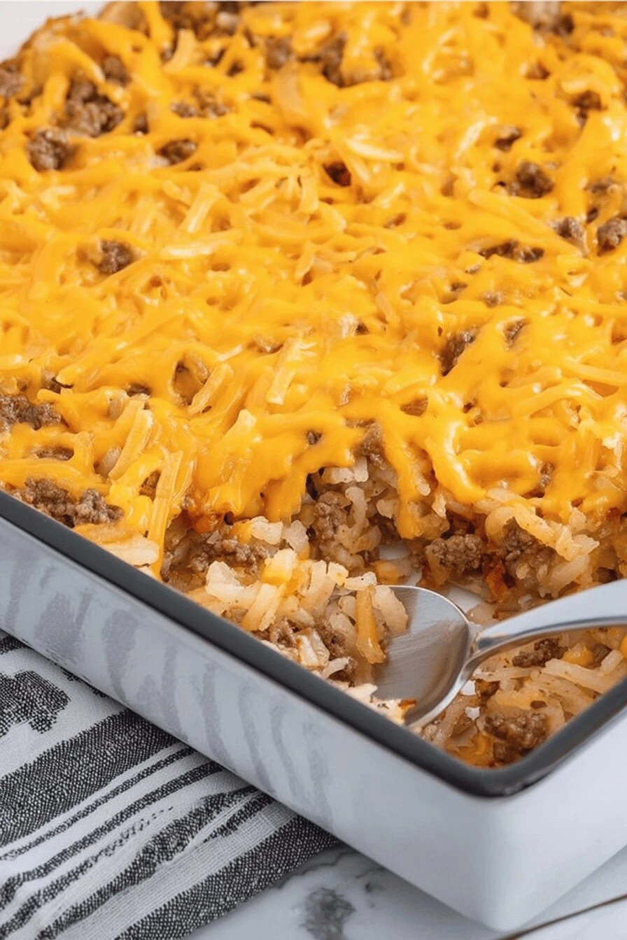 Frozen hash browns have to be thawed. All the way. Run your hands through the bag while they’re defrosting, break apart the clumps. Frozen ones release water while cooking — turns into a stew, not a casserole. That’s the mistake. Drain the ground beef. Don’t save the fat thinking it’ll add flavor. It doesn’t. It just makes the bottom greasy.
