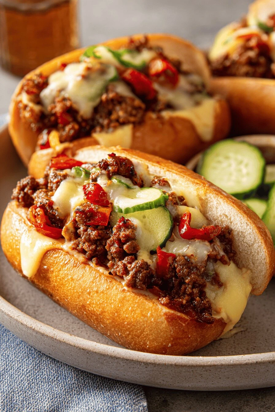 Red bell pepper, sliced thin. Not thick. You need them flexible enough to bend into the bread. One medium onion. Also thin. They cook down to almost nothing in the pan. Vegetable oil. Not olive. Olive burns at this temp. Use about 65 ml—slightly over a quarter cup. Smoked hot paprika. This is standing in for chipotle. Not the same thing but close enough that your mouth doesn’t know the difference. Ground beef chuck. 430 grams. Sirloin works if that’s what you’ve got. Chuck has more fat—stays juicier when you sear it. Cook it without stirring too much. The crust matters. Four submarine rolls. 18 centimeters each. Whatever the bakery’s got. Stale bread is actually better here. Monterey Jack cheese, sliced. Not pre-shredded. The slices melt flat. 170 grams total—about 42 grams per sandwich. Enough to pool but not enough to slide out the sides.
