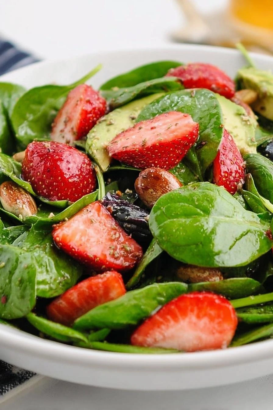 Baby spinach—five cups, washed, stems snapped off because they’re bitter and tough. Toasted walnut halves with brown sugar and cinnamon already on them. Not raw. Not burnt. Just that smell where you know it’s right. Two cups of strawberries sliced thin. A cup of fresh blueberries. One ripe avocado, diced—not mushy, not hard, that exact middle moment. Four ounces of crumbled goat cheese. Works better than feta here. Melts slightly on contact. Red wine vinaigrette. A third cup. You could go less. You could go more. Depends on how much you like dressing.