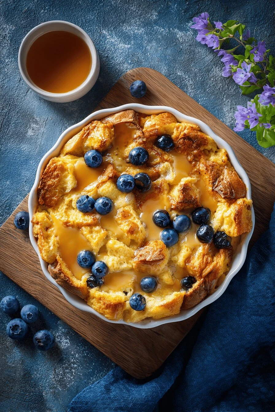 Warm, custardy comfort food that tastes like someone spent hours on it — takes 25 minutes to throw together. The blueberries burst while it bakes, staining everything this rustic purple. Maple sauce pools underneath, gets absorbed into the warm bread, tastes different every bite. Leftovers (if there are any) reheat better than fresh. The bread gets denser, almost cakey. Not sure why that works but it does. One baking dish. Cleanup isn’t a thing.