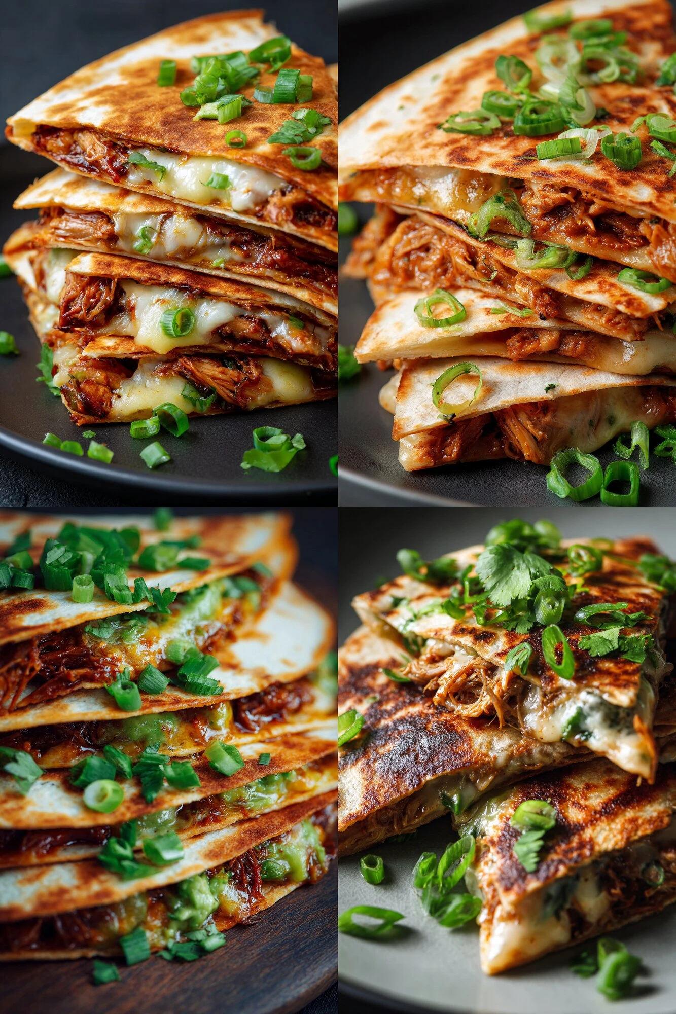 Don’t overcrowd the pan. One quesadilla per pan, maybe two if they’re small and the pan is wide. Crowding drops the heat. Tortillas steam instead of crisp. The sauce from the pork will soak into the tortilla if you let it sit too long after assembly. Assemble and cook within a minute. Green onions can go in raw if you’re out of time, but they lose their point. The char is why you’re doing this. Monterey Jack melts faster than cheddar. That’s the whole reason it’s here. Roasted poblano peppers — don’t use fresh poblano. Fresh is watery and tough. Roasted is the move. The cilantro wilts in seconds. If you like it raw and bright, scatter it on after cooking. Actually — do it that way. Better.