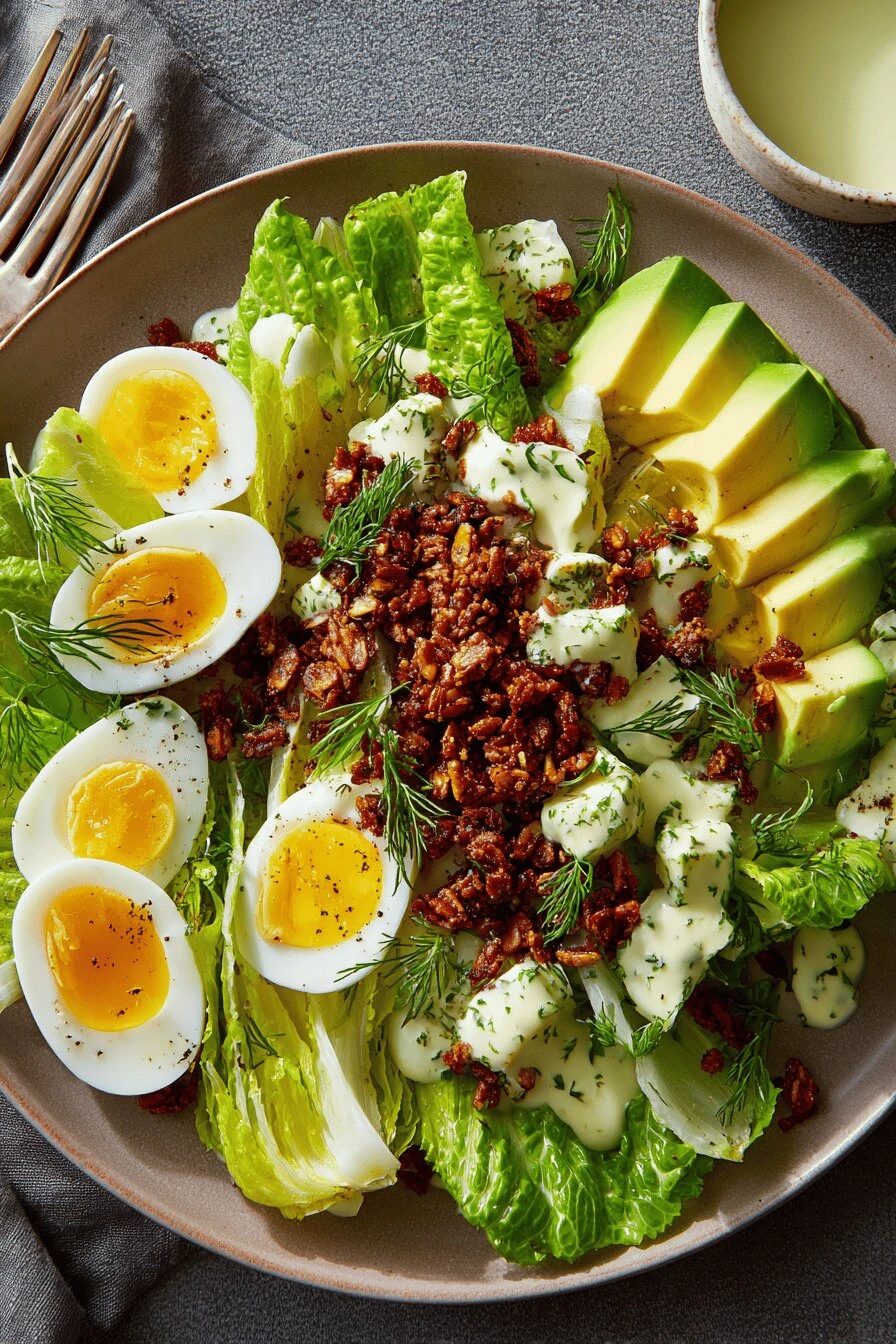 Avocado egg salad that works for actual breakfast. Not trying to be something it’s not—just bibb lettuce, hard-cooked egg whites, feta, and a creamy dressing that tastes like fresh herbs actually live in it. They kind of do.