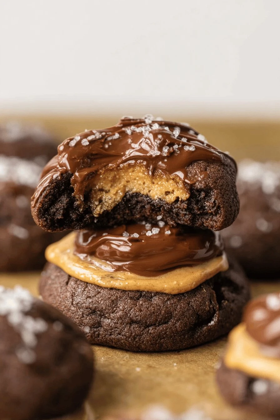 If the peanut butter mixture crumbles, add milk or heavy cream a teaspoon at a time. Just needs smoothing. Overheated chocolate seizes. It goes grainy and separated. If that happens, add warm cream very slowly while stirring. Sometimes it comes back. Sometimes it doesn’t. The egg and sugar whipping step. People skip it. Don’t. It makes the cookies chewy instead of dense. Chilling matters twice—the peanut butter disks and the dough. Both need time or everything melts and spreads wrong. Watch the edges of the cookies. Firm at the edges, soft in the middle. That’s done. Hard edges means overbaked. The instant coffee isn’t a joke. It’s a half teaspoon in the dry mix. Adds bitterness without tasting like coffee. Oven temps vary. Go lower and slower if your oven runs hot. Better to underbake slightly and have chewy than overbaked and hard. Natural peanut butter changes the game. It’s drier. It won’t work the same way. If you use it anyway, add extra butter to the mixture.