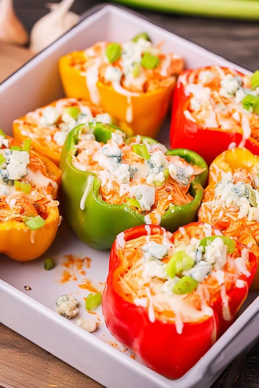Peppers stuffed with chicken take on a lively kick when Buffalo sauce joins the mix. Not just slapping stuff in and baking. No. Needs balance — cream cheese softens the heat and adds creaminess while shredded cheddar and mozzarella give stringy, melty texture that sings. Tossing ranch seasoning mixes up the flavors and adds herby depth. Steam from water beneath peppers cuts their harshness; you want tender but still holding their shape. Finally, hitting tops with extra cheddar last minute creates that golden crust that’s almost addictive. I’ve burned cheese topping more than once, so keep an eye on those spots. Green onions and blue cheese bring freshness and tang, a sharp contrast that prevents the dish from feeling heavy. Been there, done soggy peppers. You’ll want control on moisture and timing if you want bursts of flavor without drowning in wetness.