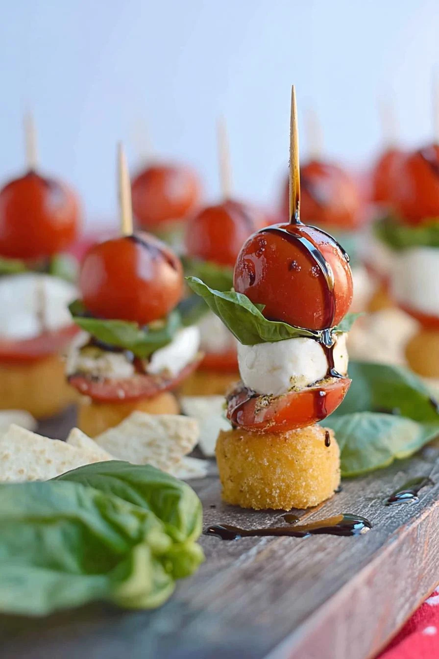 Sixteen burrata pearls. Not mozzarella. Burrata’s creamier. One inch each. Sixteen large fresh basil leaves. Green ones. The ones that smell like summer. Sixteen cherry tomatoes. Halved. Get the good ones if you can—makes a real difference. Eight artisan bread croutons. One-inch cubes. Crusty outside. The kind that actually crunch instead of just sitting there. Eight marinated artichoke hearts. Slice them thick. Not paper thin. Thick enough to hold a toothpick without folding. Two tablespoons balsamic glaze. Not vinegar. Glaze. Already reduced, already thick. Matters.