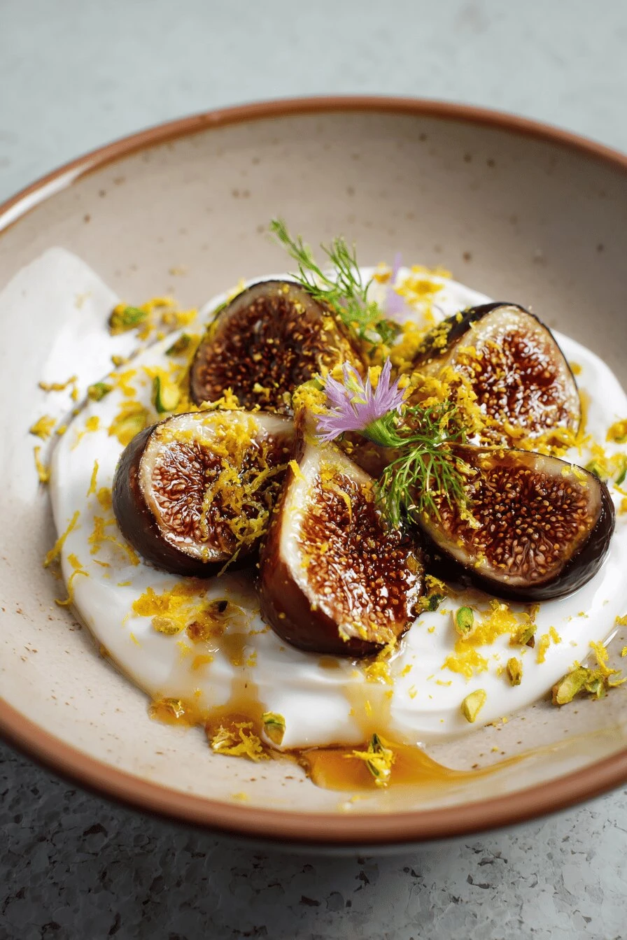 While they rest, stir lemon zest into honey if you’re using it. Let it sit. Spoon yogurt onto plates — a generous dollop, rounded scoop, the kind that looks intentional. Lean the warm figs against it. The yogurt should be cold. Really cold. That’s the whole thing. Warm against cold. Sweet against tart. It’s why this works.