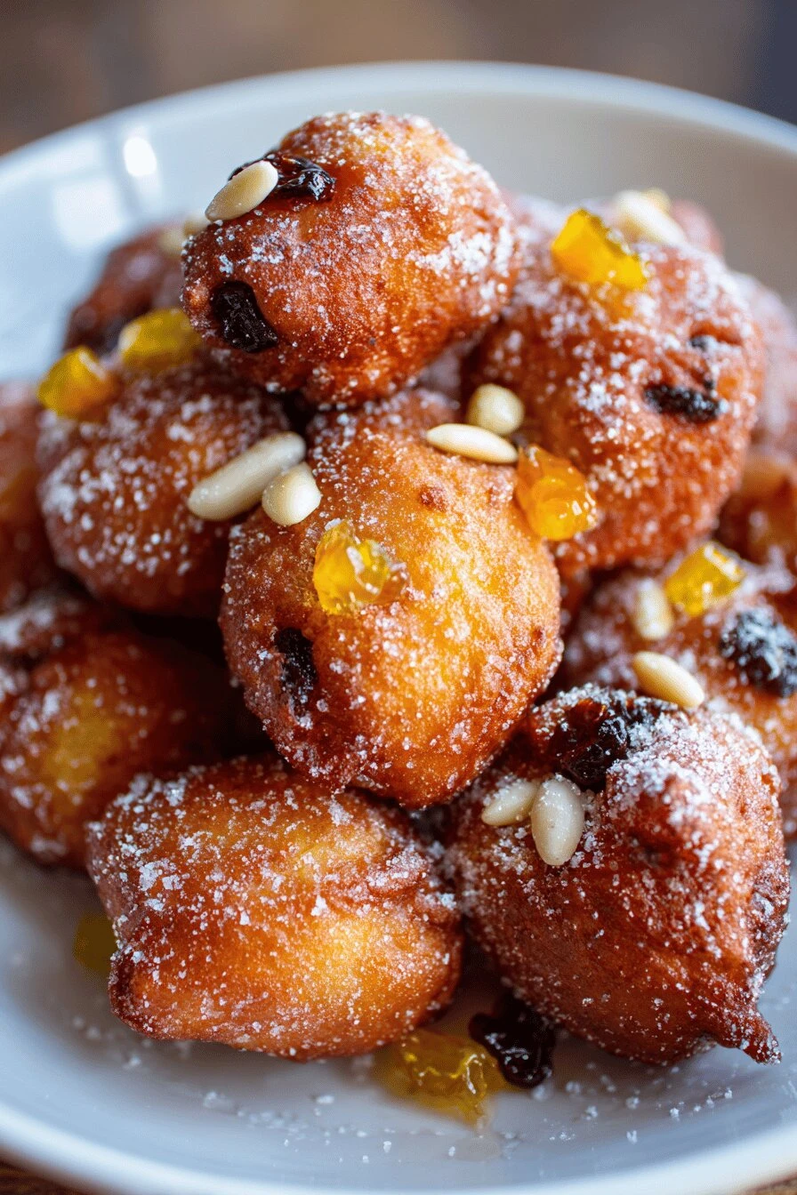 Hot oil. Two minutes per side. The sugar coating snaps when you bite into it — actually snaps, you can hear it. Raisins plumped in wine taste nothing like regular raisins. They taste like they sat overnight in something good. Which they did. Not a holiday dessert that feels like work. An hour fifteen total, most of it just letting time do the thing. The citrus and pine nuts are barely there until you taste them. Then they’re the whole point. Lemon zest. Candied peel. It’s careful but it reads as obvious once it’s on your tongue. Fried. Not baked. Crispy outside, tender crumb inside, still warm enough to taste like dessert instead of something you’re eating because it’s there.