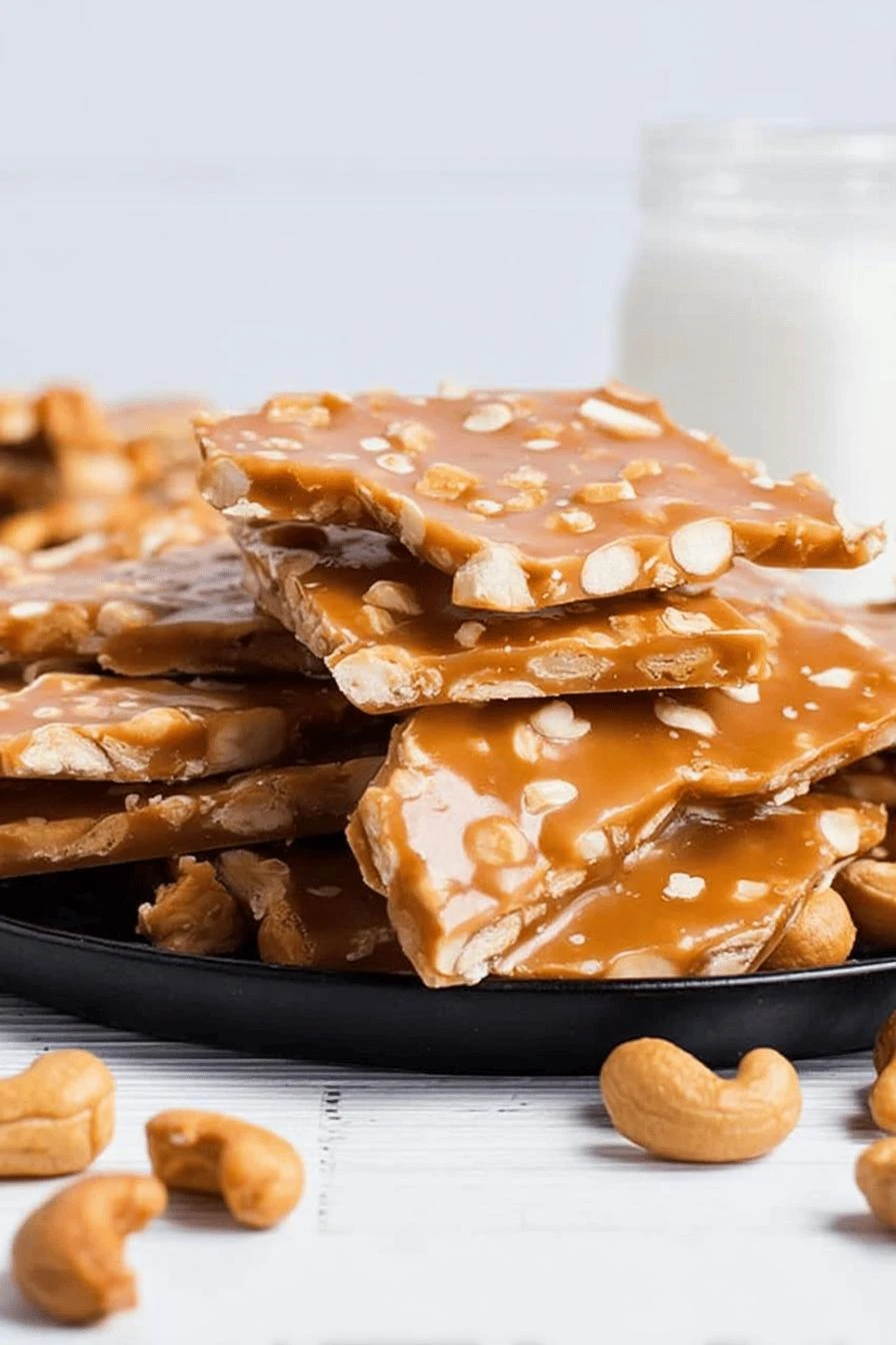Raw cashews, not roasted. Roasted ones are already slightly cooked and the heat can push them over. Raw stays fresher tasting in the brittle.