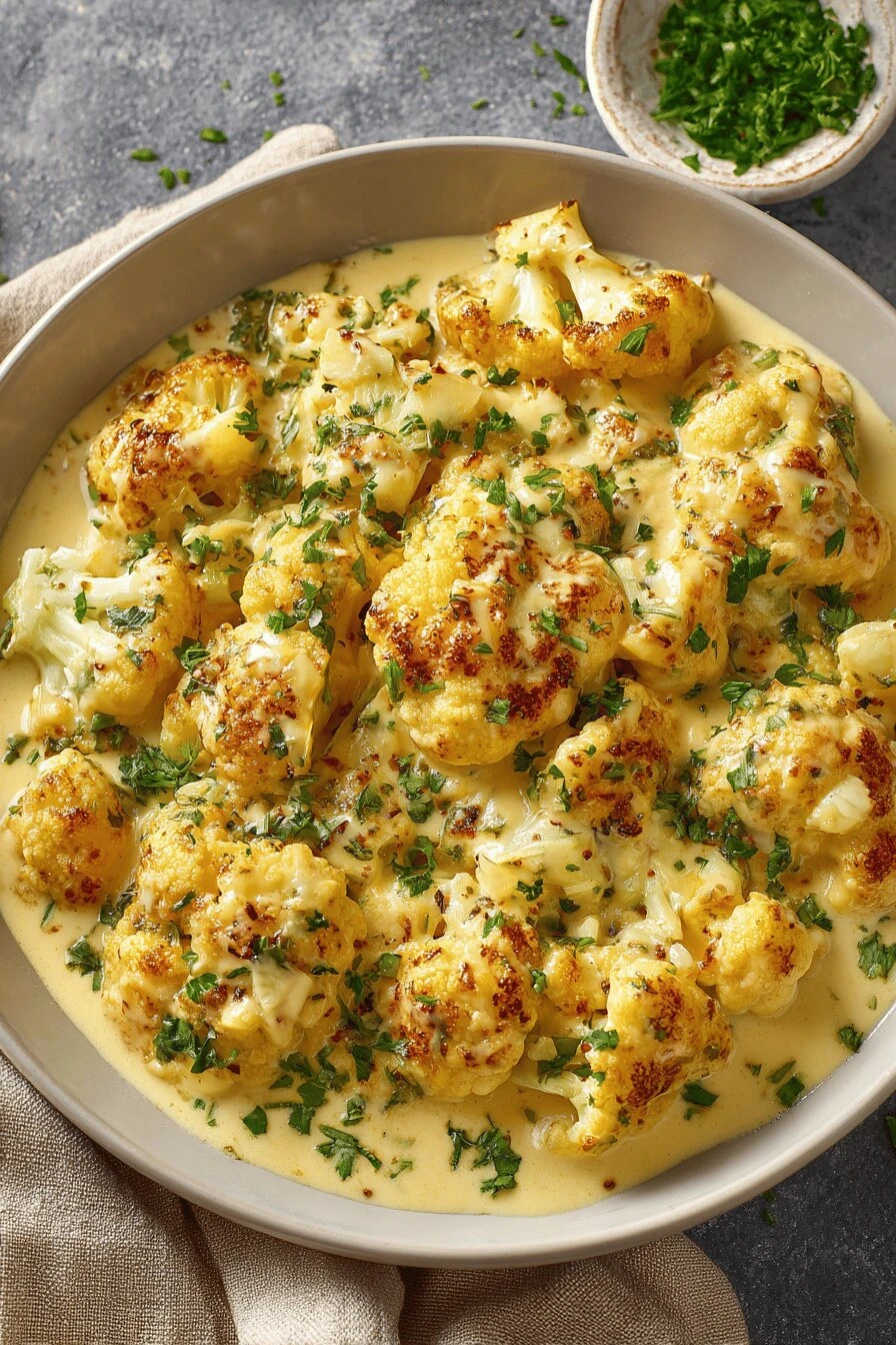 The cauliflower goes in a dish. Pour the sauce over. Do it while everything’s hot. The warmth matters—cold sauce on hot cauliflower or the other way around changes how it tastes. Serve it right away.