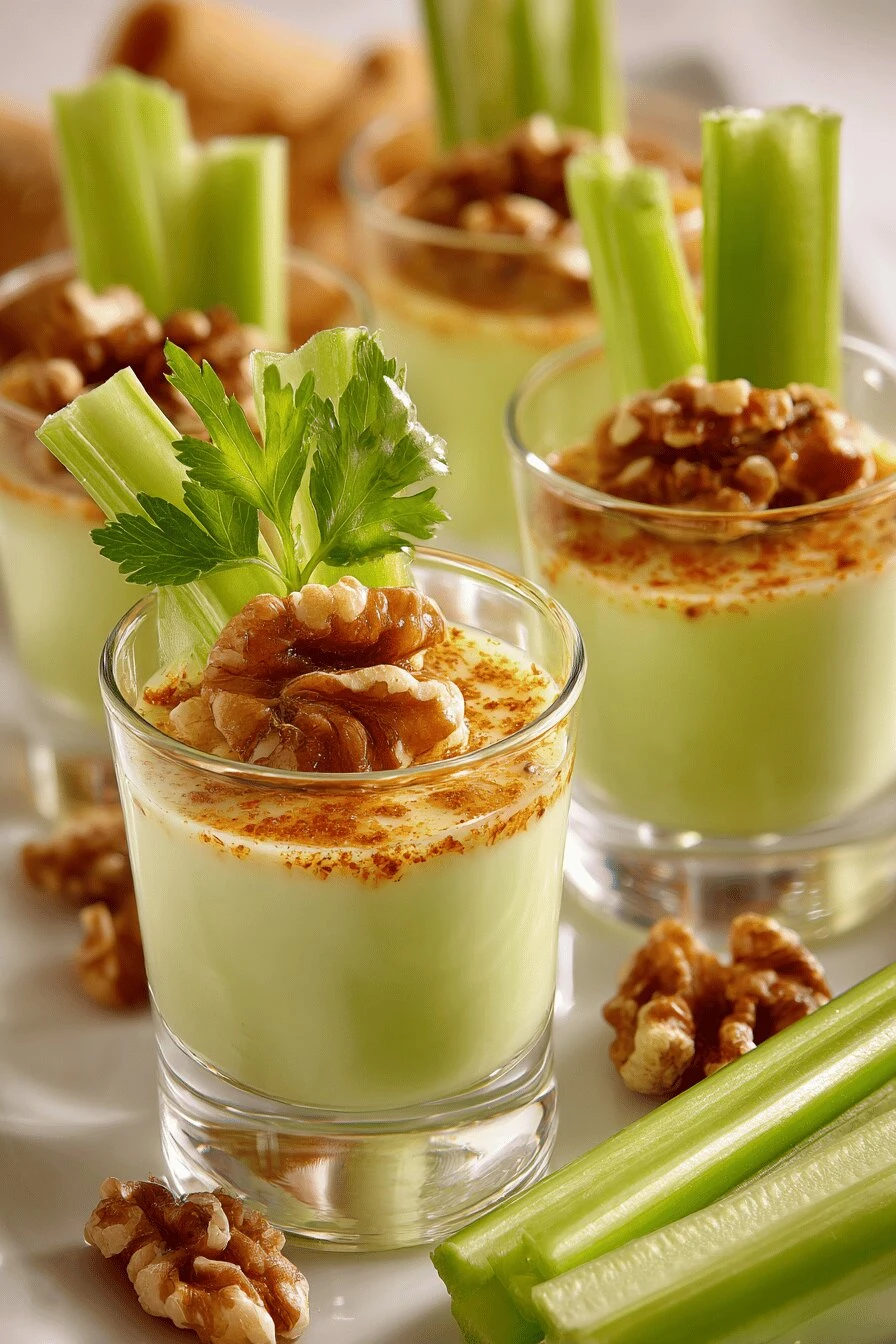 Divide into shot glasses. About a tablespoon each. Sixteen glasses worth. Sprinkle celery leaves on top of each one. A pinch. Then walnuts if you’re using them. Toasted, chopped fine. Grind black pepper fresh onto each glass. Just a little. Not a lot.