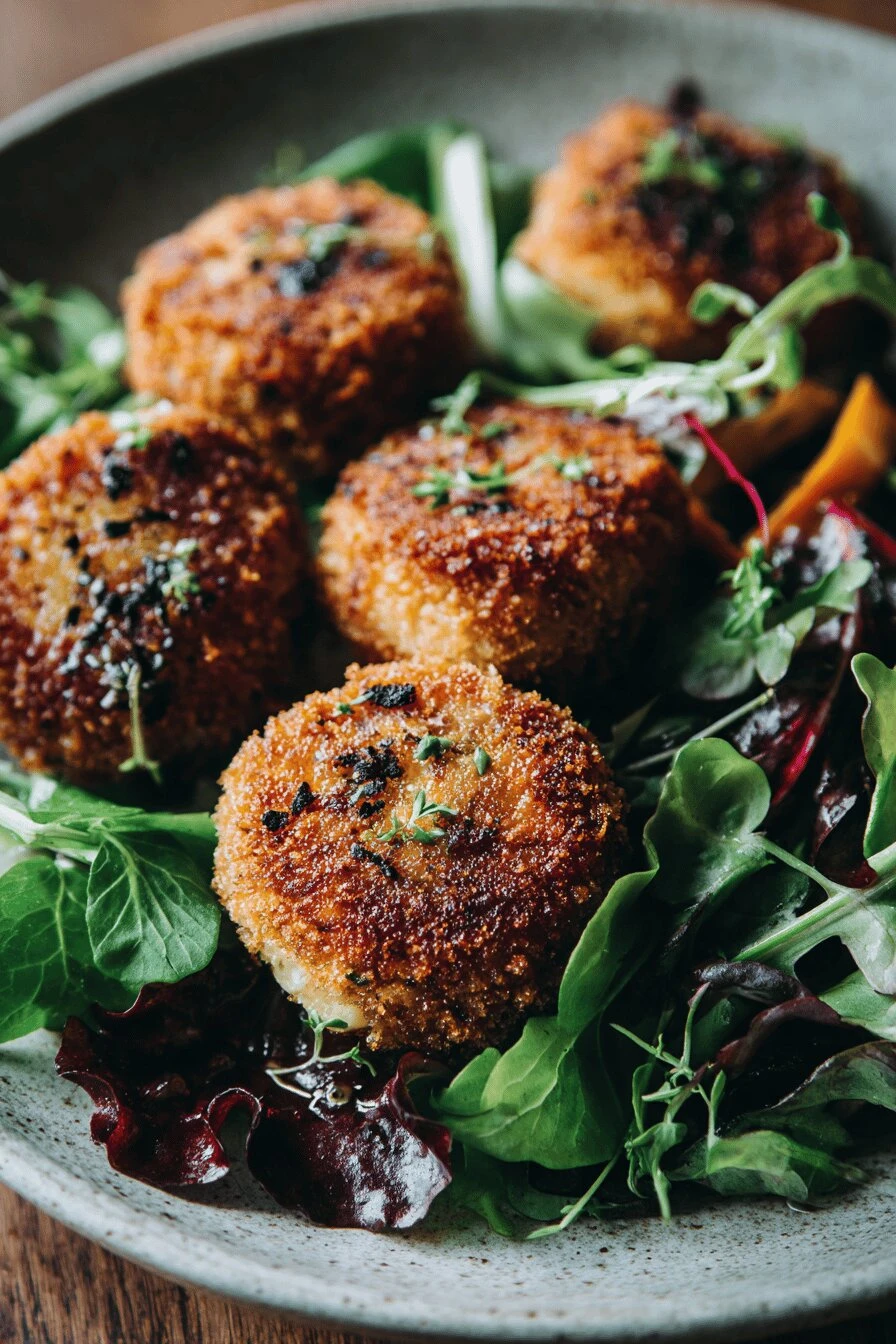 What goes with them? Green salad. Grilled vegetables — asparagus, zucchini, bell peppers. Something light because the croquettes are already rich from the cheese and walnuts.