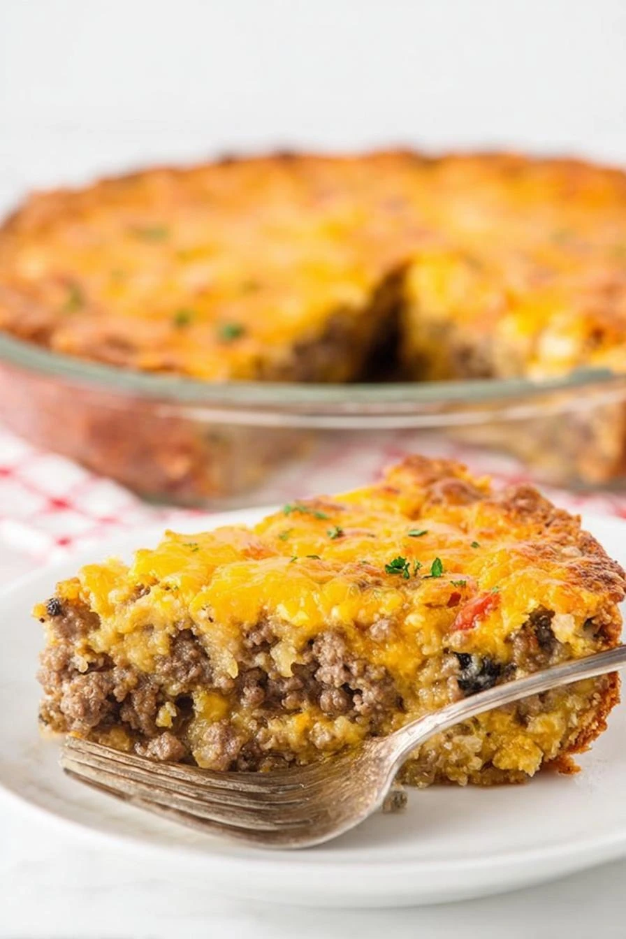 Brown ground beef with onions and spices, layer it with cheddar in a pie pan, pour an egg-flour mixture over top, and 30 minutes later it’s a cheeseburger pie that feeds a crowd. The crust forms itself. No rolling. No fuss.