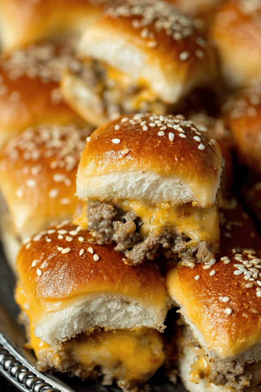 Slice the rolls in half. Lay the bottom halves on the buttered baking sheet, flat side up. Brush the underside of each bottom with softened butter. Just a light touch — you’re not drowning them. This keeps them from drying out. Whisk together the 6 tablespoons of softened butter with garlic powder and fine sea salt. Set that bowl aside. Top each bottom roll with one slice of sharp cheddar. Eight slices total for the bottoms. Layer it flat, no wrinkles. Cheese is the glue here — it’s got a job. Spoon the beef mixture onto the cheese. Not a ton. Maybe two tablespoons per slider. It’ll spread a little under the weight. Top each beef pile with another slice of cheddar. Pat it down lightly. Don’t press hard — you’re not making a brick. Just snug enough that it holds together. Place the roll tops on the sliders. This is the assembly done. Brush the tops with the garlic butter. Generous brush. Every surface should have some. Sprinkle sesame seeds evenly over everything. Bake at 345 for 13 to 16 minutes. The cheese will bubble at the edges. The buns will turn golden — not dark brown. If they’re browning too fast, lay a piece of foil loosely on top. This stops the tops from burning while the inside finishes. The real signal is the cheese. When it’s fully melted and the edges are bubbling, they’re done. Time is approximate. Your oven is probably different.