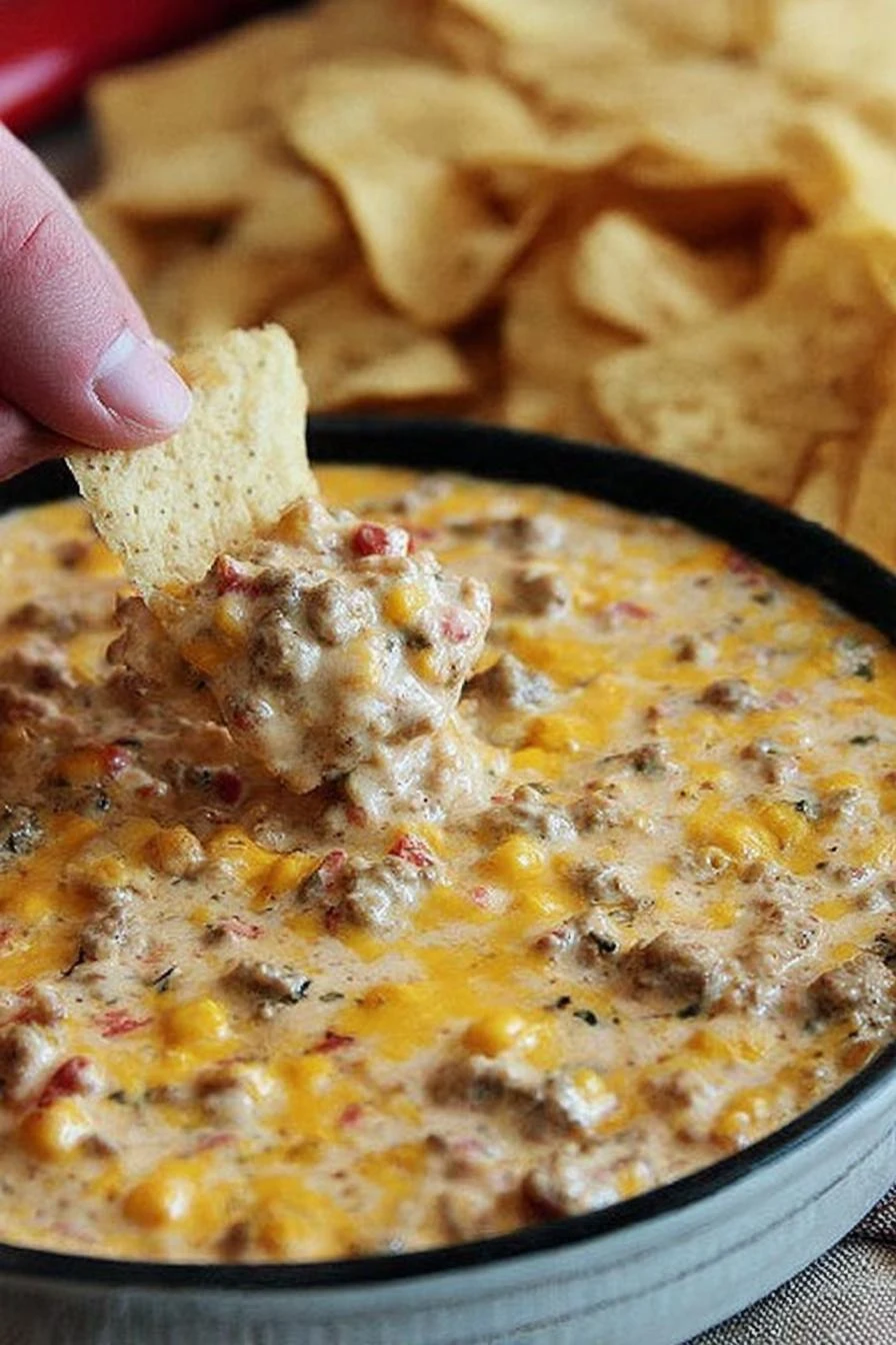 Ground breakfast sausage. One and a quarter pounds. Don’t use Italian—the herbs get weird here. Processed cheese. Velveeta if you’re keeping it normal, gouda if you want something slightly fancier. Eight ounces either way, cubed before it goes in. Corn. Drained. Canned is fine. Two cans of diced tomatoes and green chilis. Drain those too—too much liquid makes it soupy. Garlic powder. A teaspoon. Not fresh garlic. Powder works better here. Tortilla chips or corn chips for the side. That’s it.