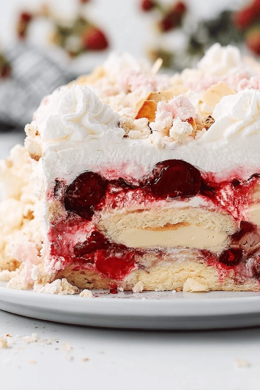 Works for a crowd without the stress—make it the morning of, chill while you do other things. The pudding layer keeps everything moist, the cherries stay bright instead of getting mushy.