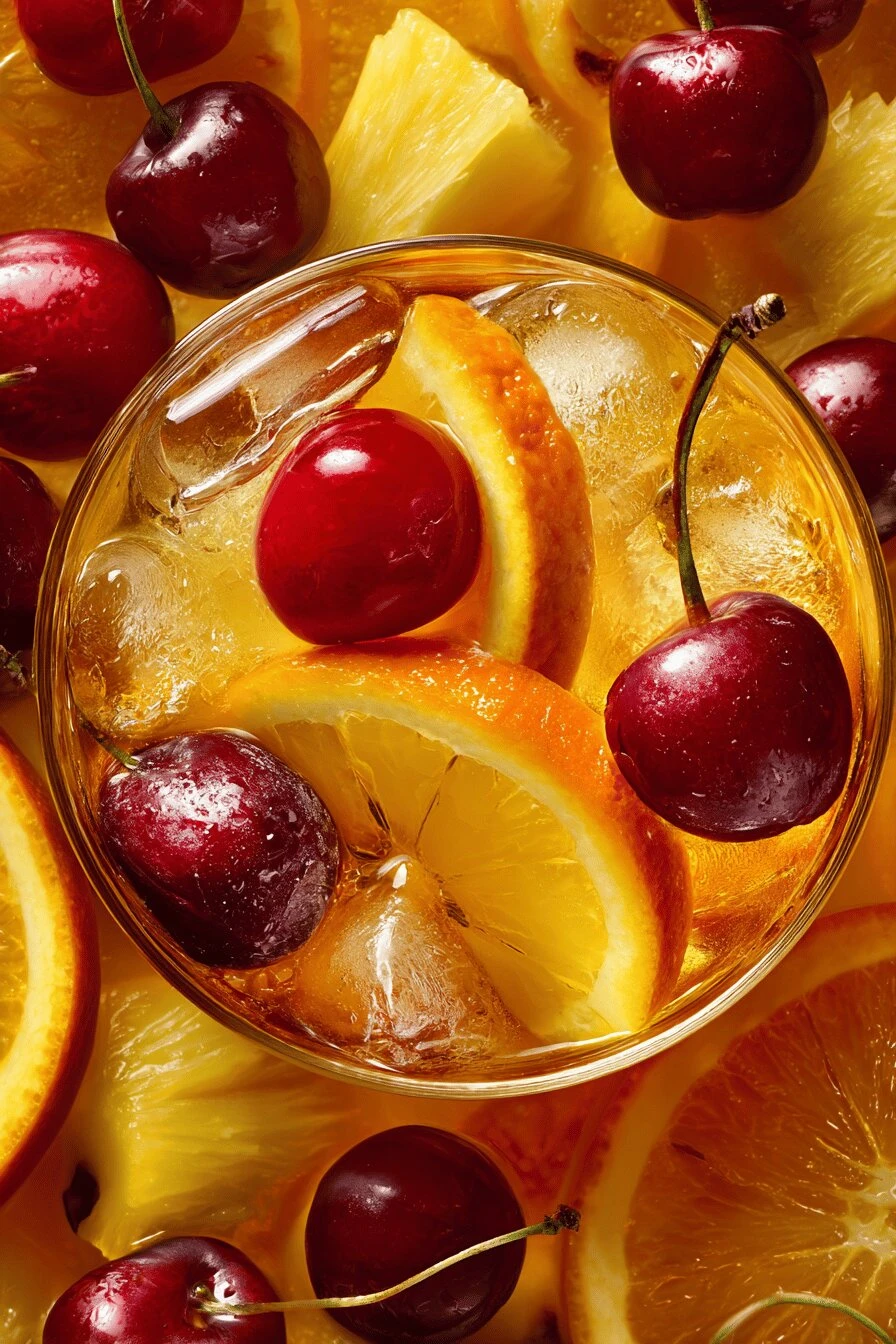 Moscato wine — 650 ml. The white kind. Not Moscato d’Asti, not the cheap stuff. The regular white Moscato or white port works, stays clean. Sour cherries in light syrup, a whole jar, about 380 ml. The syrup matters. Don’t drain it. Aged spiced rum, 120 ml — something you’d actually drink straight. The cheap stuff tastes like plastic in this. Fresh pineapple juice, 150 ml. Not concentrate, not from the can. The real thing. Cointreau, 45 ml. Orange liqueur. It’s not optional. Two plums, pitted and sliced thin — they soften the citrus, add this weird sweetness that shouldn’t work but does. Oranges, two of them, unpeeled rounds. Thin. The peel stays. Two hundred milliliters of fresh or frozen pitted cherries. Frozen works better sometimes because they stay firm longer. Ice cubes. Use plenty.