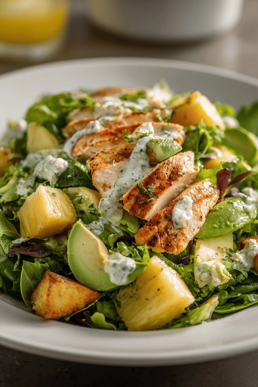 Can I make this salad ahead of time? Prep everything except assemble it. Keep the dressing separate. Slice the chicken, peel the avocado, cut the pineapple—all of it in containers. Then build the salad right when you eat. Avocado browns if it sits sliced more than a couple hours.