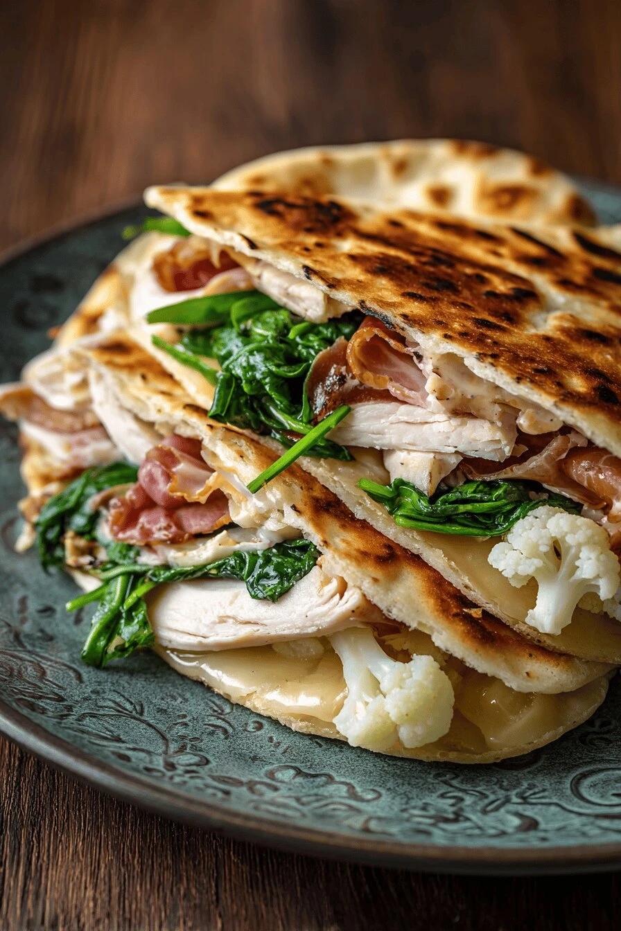 Two chicken cutlets—thin ones, pounded if they’re thick. Don’t skip this. Olive oil. About 15 ml. Not vegetable oil. Olive oil matters here. Fresh baby spinach. A big handful. Frozen won’t work—too much water. Piadina bread or flatbread. Piadina’s better but regular flatbread gets the job done. Two slices prosciutto. Not ham. Prosciutto. The salt is intentional. Mild provolone. Two slices. The mild part keeps it from tasting sharp. Pickled cauliflower florets. A small handful. Just enough to cut through the richness. This is the thing that makes it actually work. Salt and cracked black pepper. Coarse salt. Freshly cracked pepper. Both matter more than you’d think.