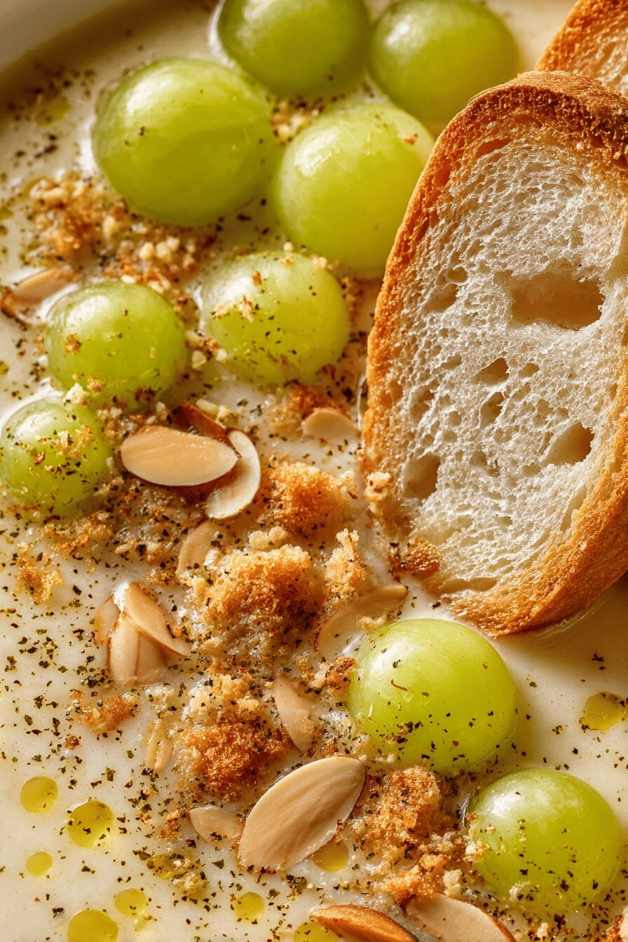 Sliced almonds. Three hundred milliliters. Don’t use blanched if you can find regular—the skin matters. Garlic. Four cloves, minced small. Raw garlic mellows when you toast it in oil, which is almost the whole point here. Extra virgin olive oil. Forty-five milliliters gets heated first, then more drizzled at the end. The quality shows. Vegetable stock. One liter. Cold or room temp, doesn’t matter at this stage. Bread crumbs from actual rustic bread. Two hundred eighty milliliters. Not panko. Not the boxed stuff. Real bread, torn up and turned into crumbs. The texture comes from this. Salt and pepper. Taste it as you go. You’ll need more than you think. Bread cubes for garnish. Cut from the same loaf if you have it. They get crisped in a skillet with olive oil. Green grapes. Ten of them, halved. Sweet, cold, cuts through the richness.