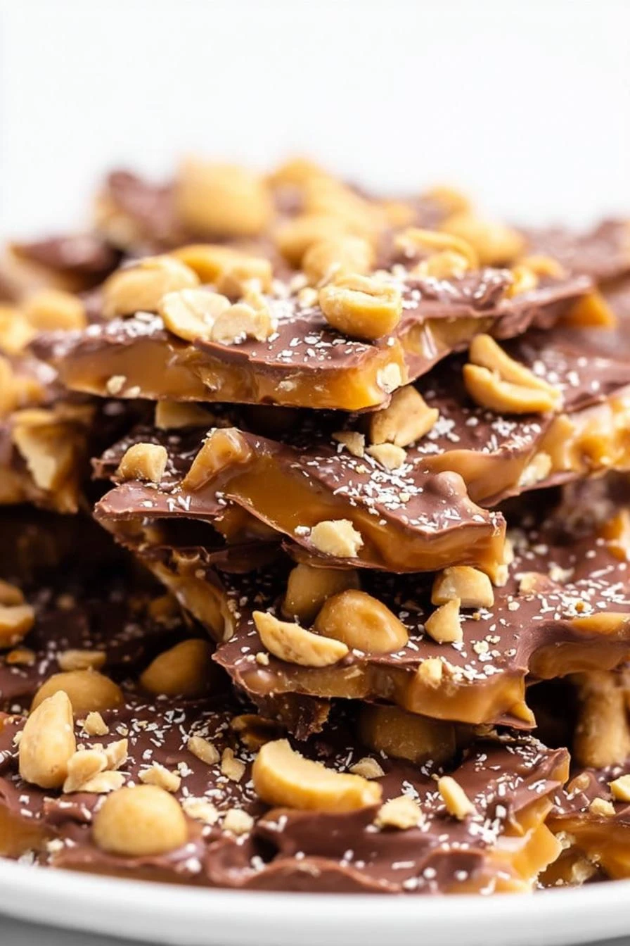Watch the heat the whole time. It goes from caramel to burnt in one minute of inattention. Keep the burner at medium, not medium-high. The peanuts on the bottom stay crunchy the whole way through. They don’t get soft. The toffee around them gets chewy. Don’t use chopped peanuts for the base layer—use whole roasted salted ones. Different texture. Whole ones hold the structure. The bark sets hard but snaps instead of shattering. It’s actually impossible to bite cleanly. That’s correct. If your kitchen is hot, chill it faster. If it’s cold, it sets on the counter fine. Almond extract sounds optional. It’s not. It makes the caramel taste like it went somewhere. Without it, it tastes like plain toffee.