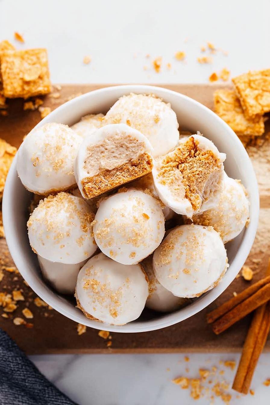 Cinnamon Toast Crunch dry mix heated before mixing with cream cheese to avoid lumps and improve texture. Cream cheese whipped until fully creamy; dry mix folded in gently. Chilled 2 hours to firm. Dough scooped and rolled, then dipped in melted almond bark or white chocolate alternative. Coated bites topped with crushed cereal while coating is still wet to lock crunch. Chilling solidifies coating crisp and keeps bites manageable. Nutrition moderate, carbs dominant. A snack with nostalgic cereal flavor and creamy tang. Substituting almond bark with colored candy melts or white chocolate gives variation. Heating dry mix crucial - never skip or lumps ruin bite. Visual cues guide timing more than clocks, texture and aroma the key signals.