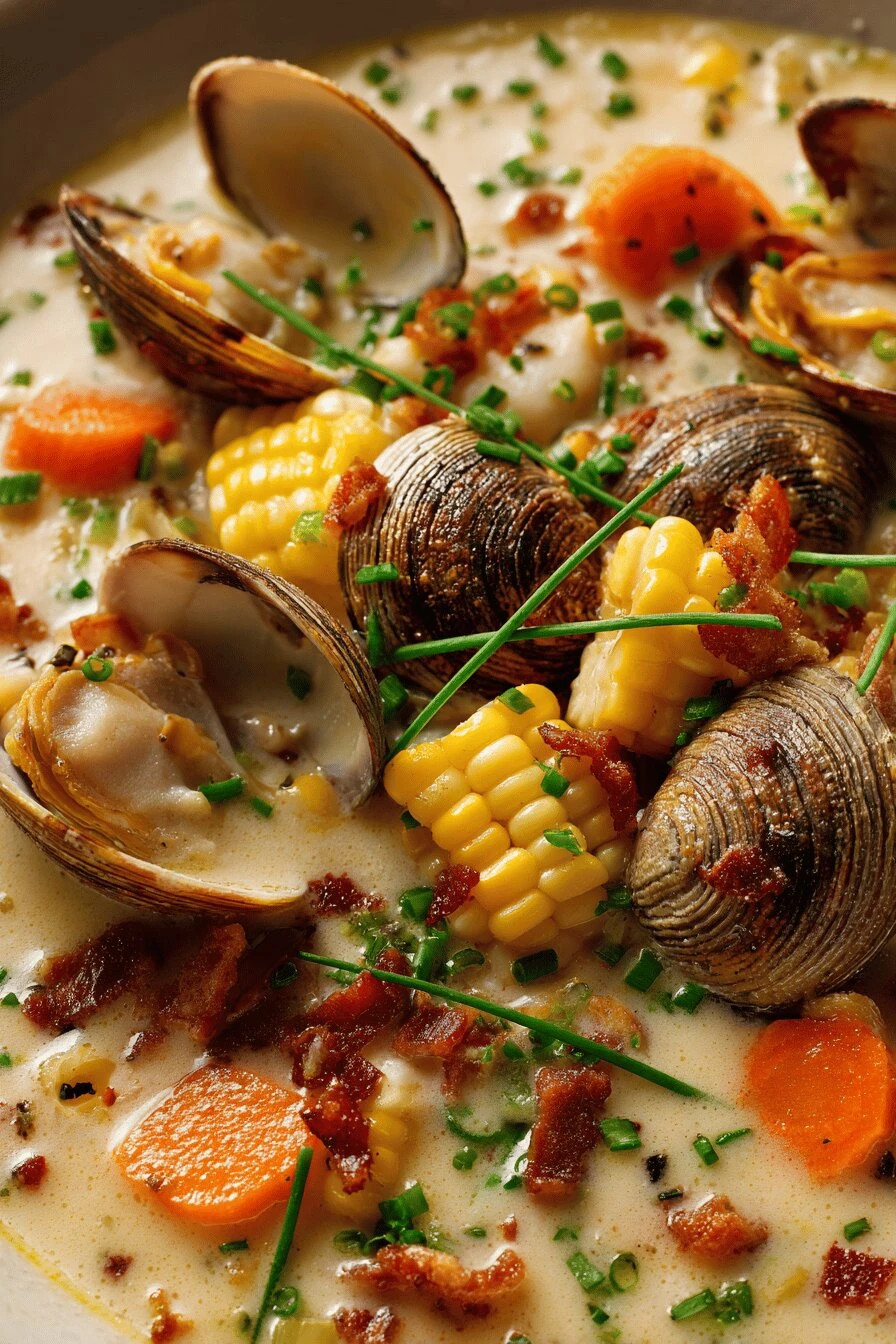 Butter. Four tablespoons. Real butter, not the fake stuff. Sets the whole flavor. One medium onion, one small carrot. Finely chopped. Size matters here because you want them to disappear into the soup, not float as chunks. All-purpose flour. Just two tablespoons. Makes the roux that thickens everything. Clam juice. Two bottles. The briny stuff that tastes like the ocean actually lives in your pot. Whole milk. Three cups. Not cream—people do that, it’s too heavy. Milk works better here. Potatoes. Waxy ones if you can find them. They hold their shape instead of turning to mush. Dice them small. Bay leaves. Two. Nutmeg. A pinch—like, seriously, a tiny pinch. Corn kernels. Fresh or frozen. One and a quarter cups. Canned clams in two cans. Drain them. Throw the juice away. You’re using the clam juice from the bottles instead. Pancetta cut into lardons—those are just little chunks. Half a pound. This is where the smoky, salty, bacon-like thing comes from. Fresh clams if you want to get fancy. Twenty of them. Optional. They’re nice but not required. Water, chives, salt, pepper.