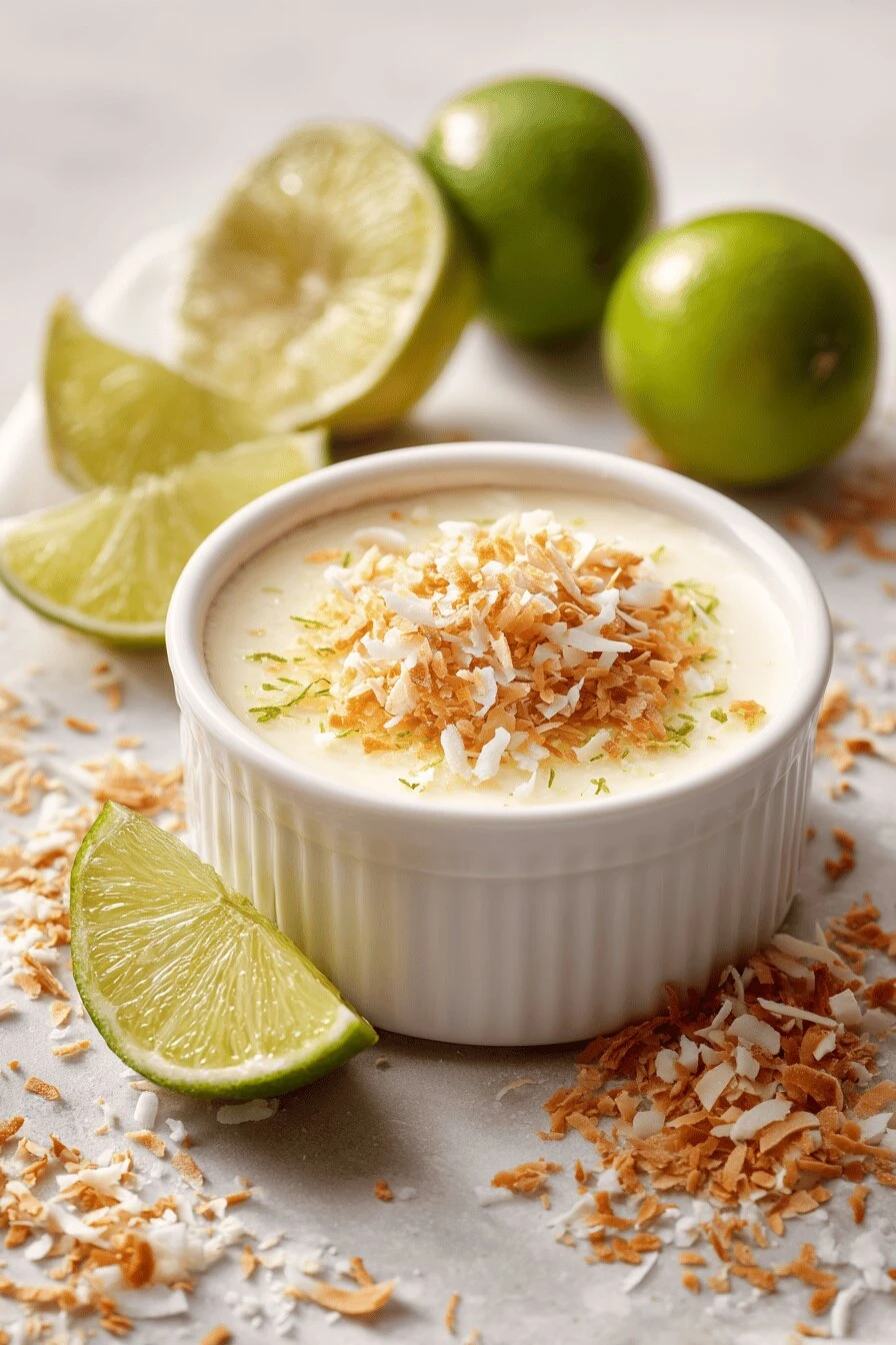 Right before you serve, scatter the toasted coconut on top. It melts slightly into the warm custard if you eat it fresh, but the crunch stays there too. The citrus and the nuttiness happen at the same second. Orange zest swaps fine for lime if you want that direction instead.