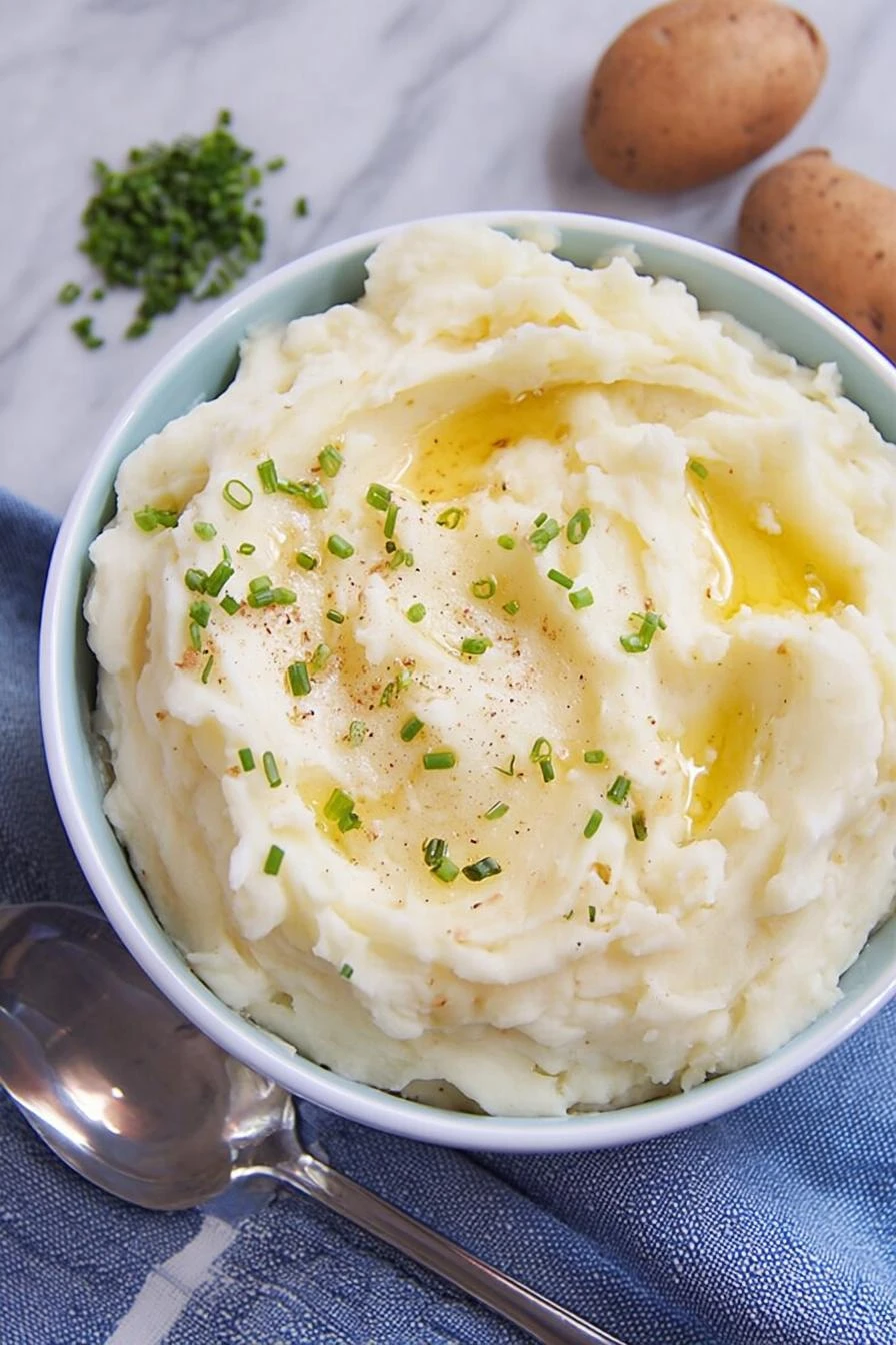 Yukon Gold. Not russet. The texture stays right—creamy but not mealy. Three pounds. Peel them, cut into chunks about the size of golf balls so they cook even. Half-and-half warmed beforehand. Cold cream seizes the potatoes. Doesn’t work. Butter softened—not melted. Four tablespoons. Roasted garlic mashed fine. Four cloves. Fresh herbs matter here. Chives and parsley. Frozen doesn’t do it. Fine sea salt and cracked black pepper. Not pre-ground. Crack it yourself if you have the time.