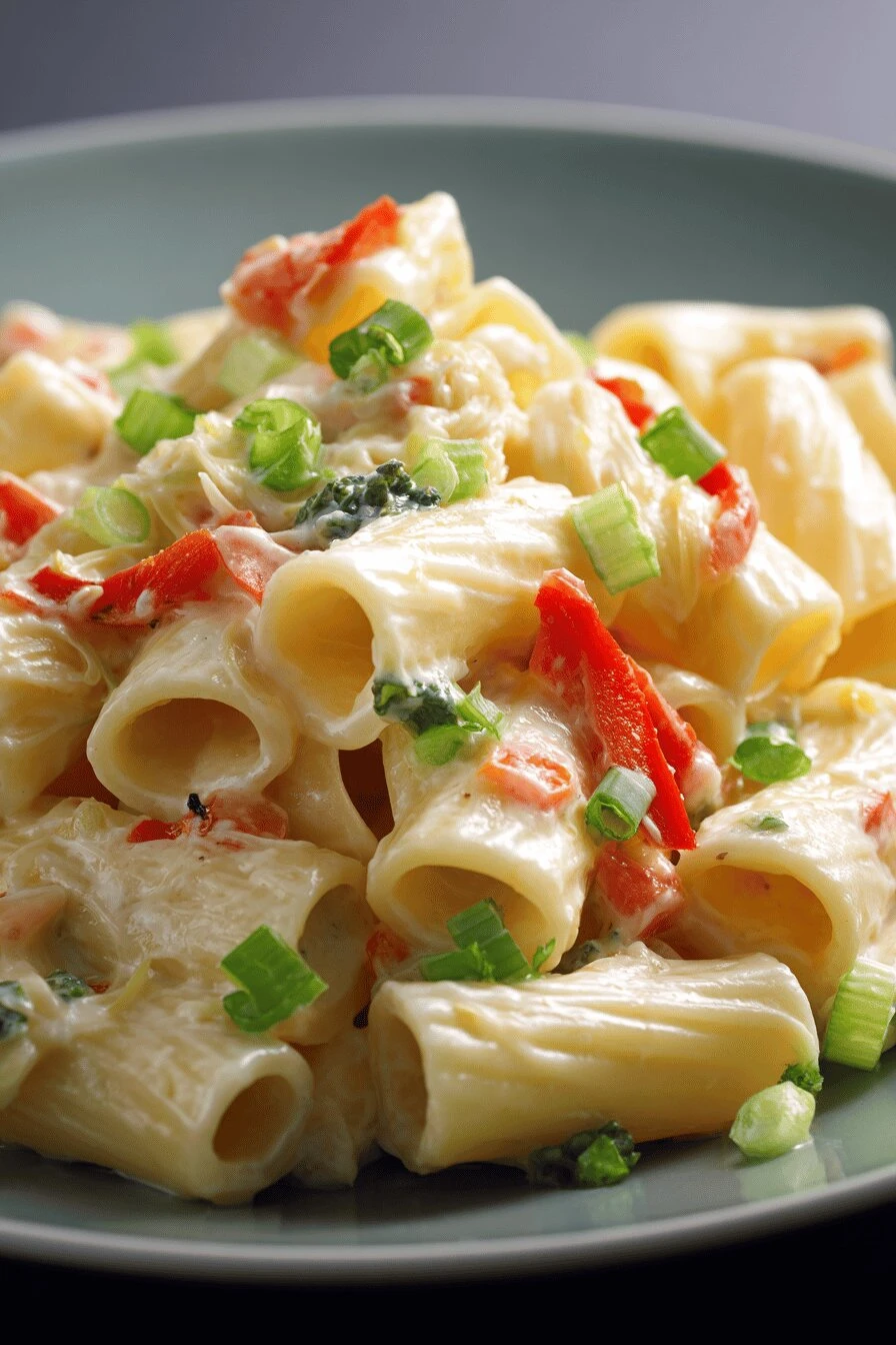 Does this actually taste like spinach and artichoke dip? It tastes related to it. Same idea—creamy, artichokes, cheese. But it’s pasta so it’s different. The dip version has more cream and way more cheese per bite. This is lighter. More balanced. You’ll see.