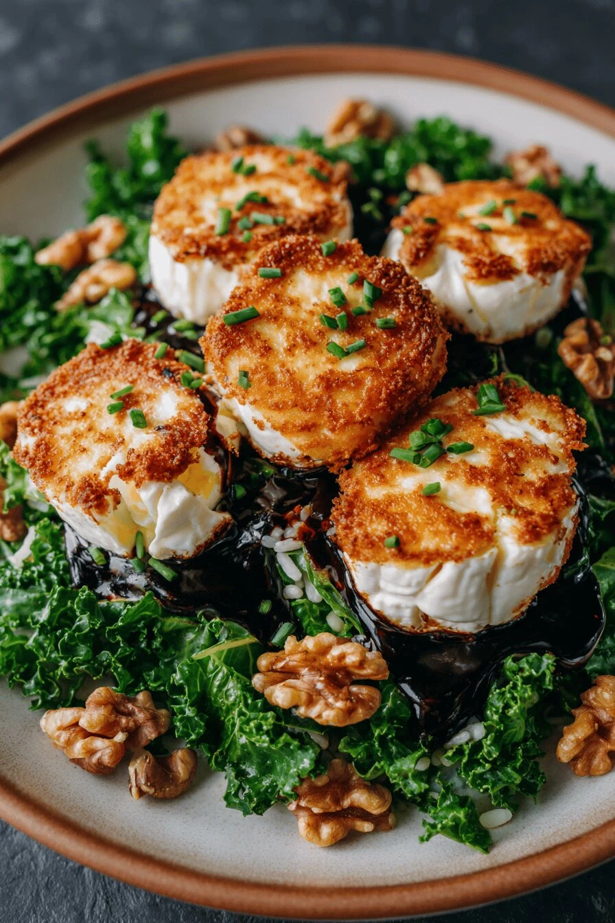 - 9 Portion kale salad on plates, top with crispy goat cheese rounds, sprinkle crushed walnuts. Finish with drizzle of honey over everything for contrast.