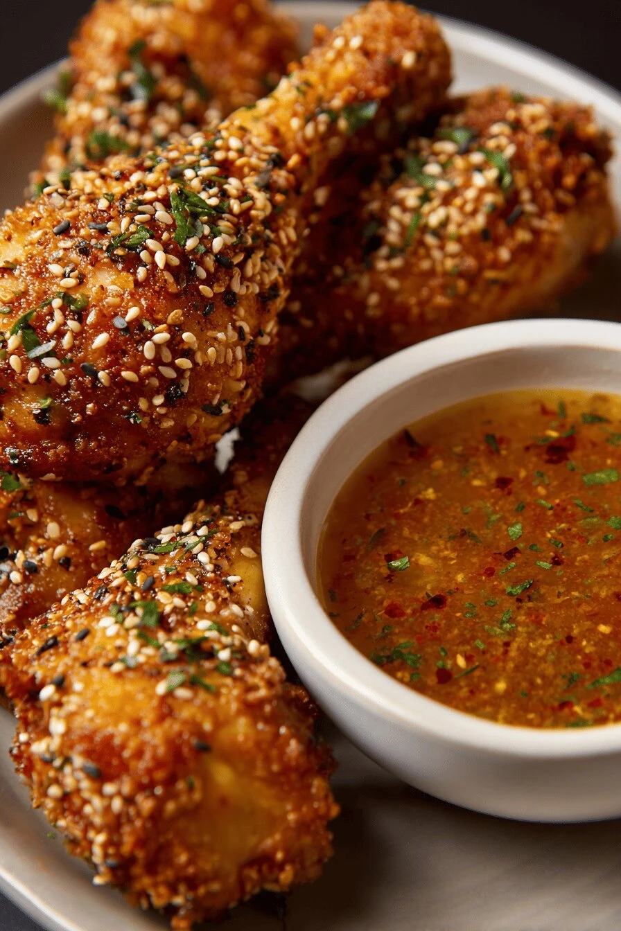Crispy sesame-coated drumsticks straight from the oven. Skin shatters when you bite into it. The sauce is spicy and bright—lemon cutting through heat—and you can either dip or pour. Takes 22 minutes to prep, 55 in the oven. Made these last week when I had nothing planned and drumsticks on sale. The sesame stays put because the avocado oil doesn’t burn, and brown sugar helps it crust up instead of sliding off.