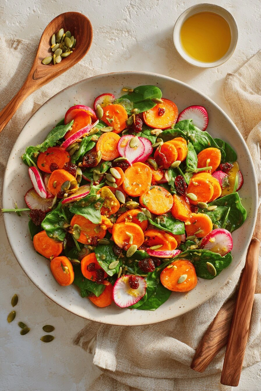 Thin sliced carrots. Radishes. A ginger-lime dressing that actually tastes alive instead of sad salad drowning in vinegar. This is what 15 minutes looks like when you stop overthinking it. Had a bowl of raw spinach sitting around, some carrots getting soft in the crisper drawer—tossed them together with what was in the pantry and somehow ended up with something people actually wanted to eat.