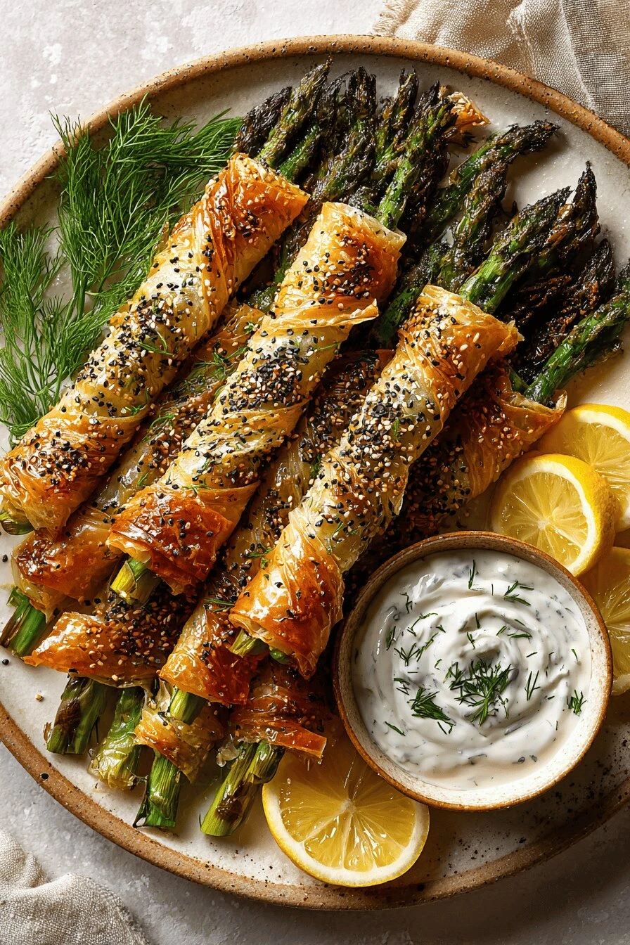 Crispy asparagus with a crunchy filo shell and a yogurt and dill sauce that’s cold and bright. The contrast does most of the work.