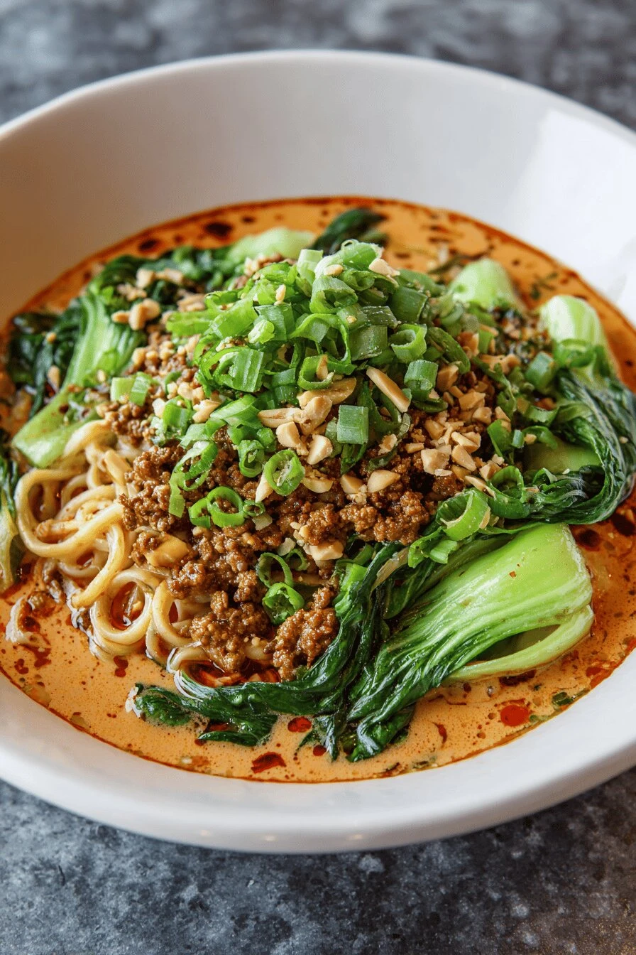 Dan dan mein noodles hit different when the sauce is right. The sesame paste base is thick and nutty. The Sichuan peppercorns numb your mouth a little. The chili crisp adds actual heat, not just color. Ground pork gets sticky and clingy. Bok choy stays bright. Everything works together without pretending to be something it’s not.