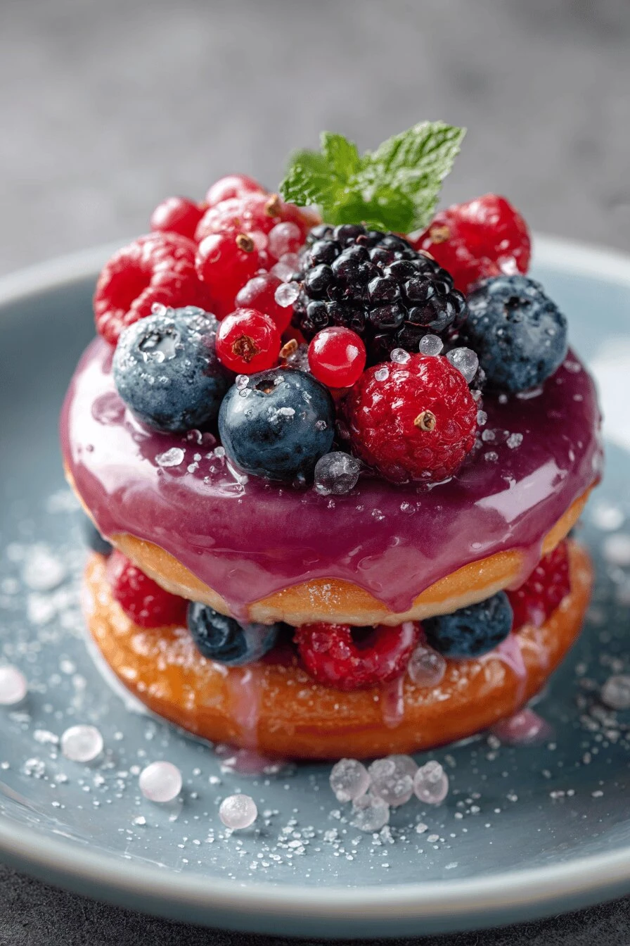 - 5 Pipe decorative swirls of mascarpone cream along top ring. Scatter fresh cherries and strawberries across cream. If using, sprinkle crunchy sugar pearls for sparkle and contrast. Keep refrigerated until serving. Best eaten the same day before donuts soften excessively.
