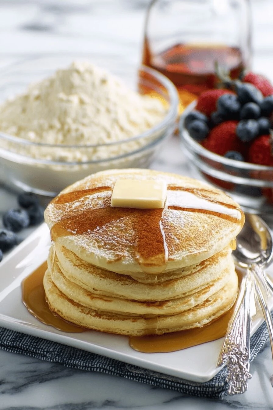Can you use this pancake flour recipe without baking powder? No. Baking powder is what makes them rise. Without it, you’re making crepes. Not pancakes.