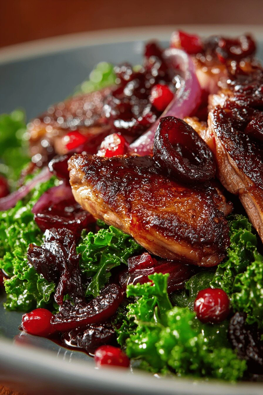 Slice the duck thin. Stack it on a plate with the kale underneath. Onions and cranberries scattered on top. Ladle the warm chocolate red wine sauce over everything. Generous. It soaks into the kale, it pools around the duck.