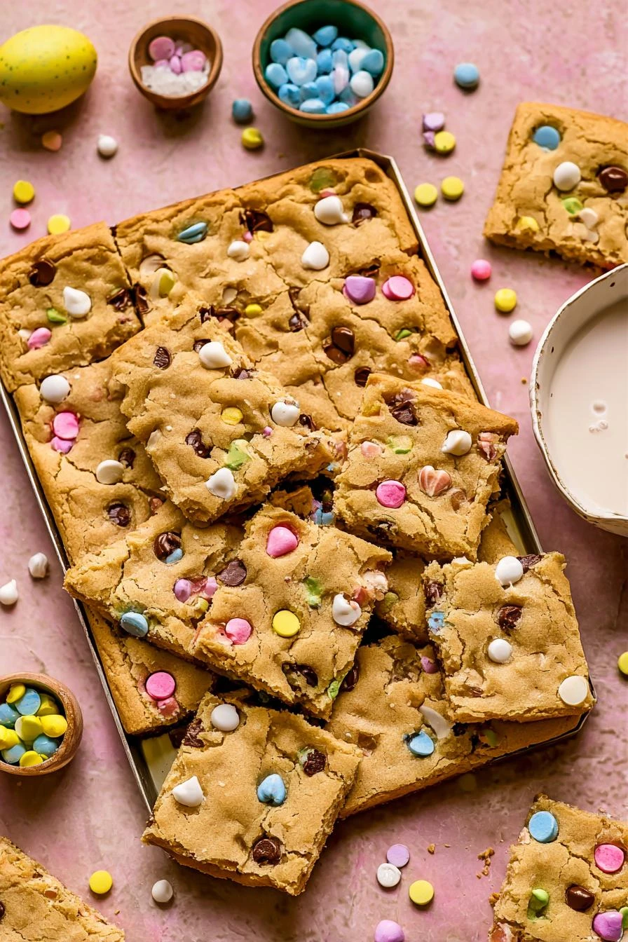 Cadbury eggs melting into warm chocolate chip cookies. That’s it. That’s the whole thing. Made these last Easter when someone brought a bag of the little cream eggs and I was like, why are we not putting these in cookies? Cut them up, fold them in, 23 minutes later you’ve got gooey pockets of caramel and chocolate in every bite. Sheet pan means no fussing with individual cookies. Just press and bake.