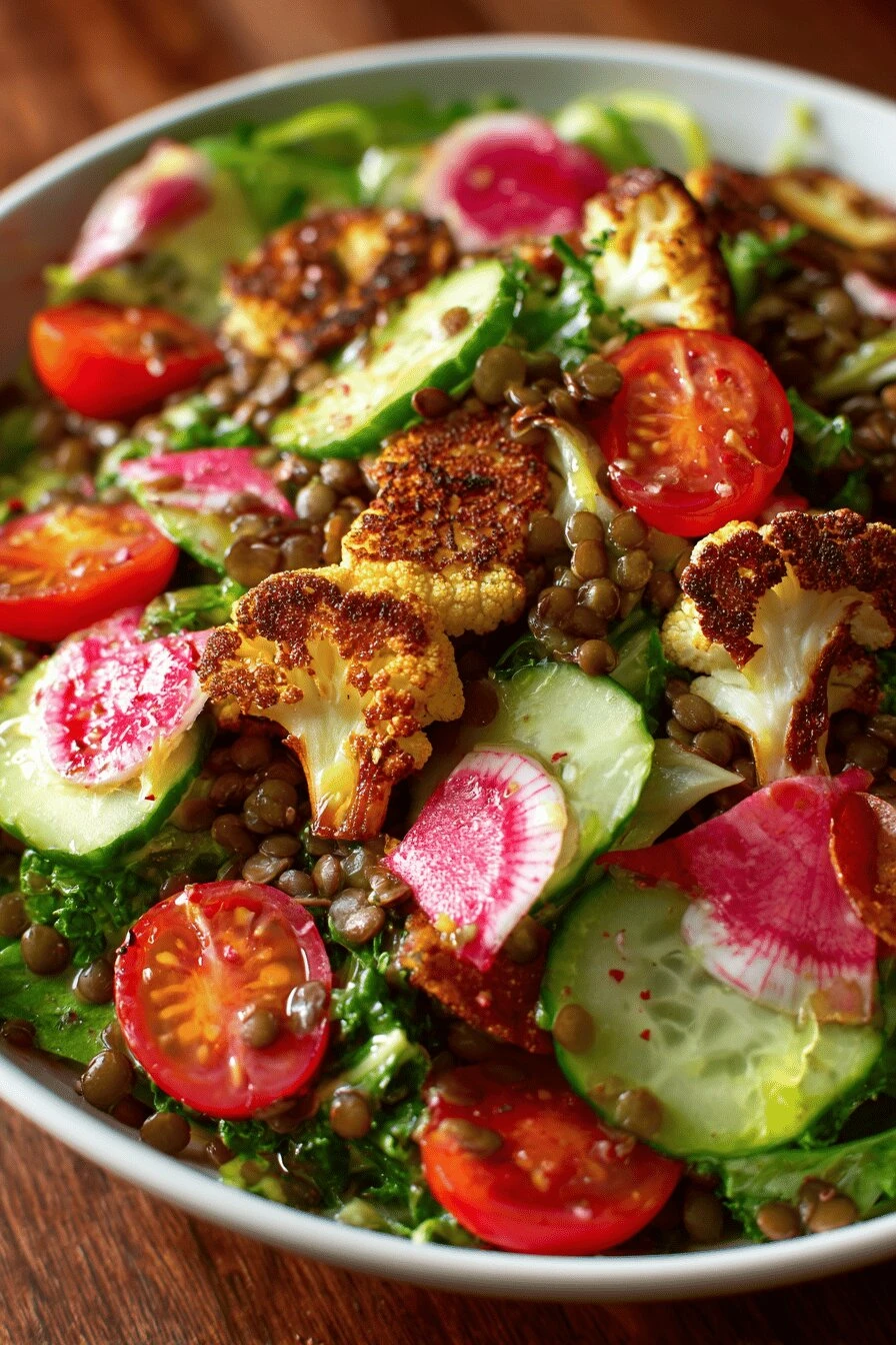 Can I make this lentil salad recipe ahead of time? Not the whole thing. The lettuce gets sad. Make the roasted cauliflower salad part — cauliflower, lentils, dressing — the day before. Keep it separate from the greens. Assemble it an hour before you eat. Add croutons right at the end.