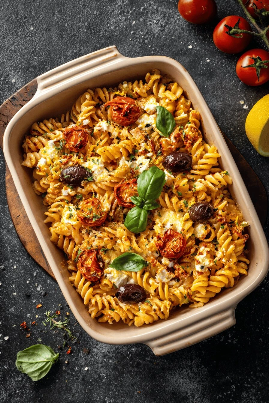 Takes 50 minutes total and maybe 15 of those are actual work. Rest is just waiting. Vegetarian but tastes like it has meat in it. Something about the feta and roasted garlic does that. Works cold the next day — better, maybe. Doesn’t get better, but it doesn’t fall apart either. One dish. One baking pan. Cleanup is basically nothing. Mediterranean flavors without the pretense. Just tomatoes, cheese, oil, herbs.