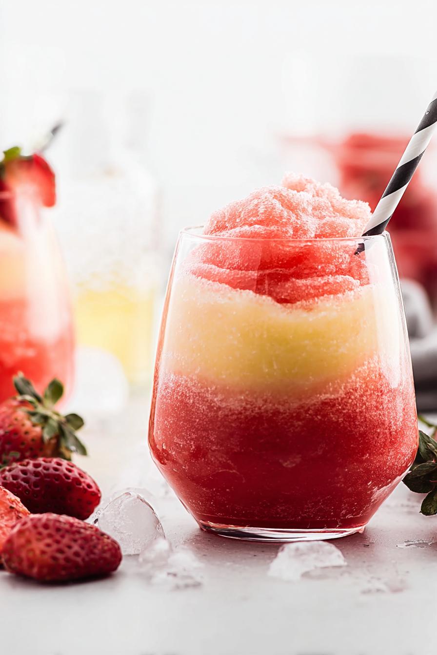 - Glasses ready? Spoon ½ cup strawberry slushie to bottom. Then gently layer ½ cup pineapple on top. Visual effect beautiful, sharp contrast. Use spoon sides, don’t just pour to avoid mixing layers. Garnish with fresh strawberry half and pineapple wedge perched on glass rim. Smell hits citrusy pine and berry sweet right away.