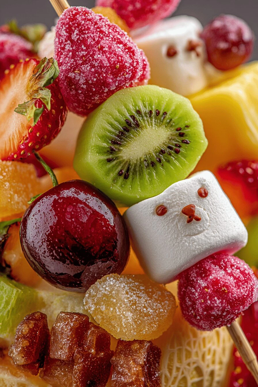 Now thread. Start with something sturdy — a pineapple cube or a marshmallow. Then alternate. A gummy bear, a cherry, a jujube, a kiwi, another gummy bear. You’re not being precise here. Just make sure the colors dance around. Red, green, white, yellow, pink. Make it look like a rainbow fruit kebab even if it’s not actually in rainbow order.